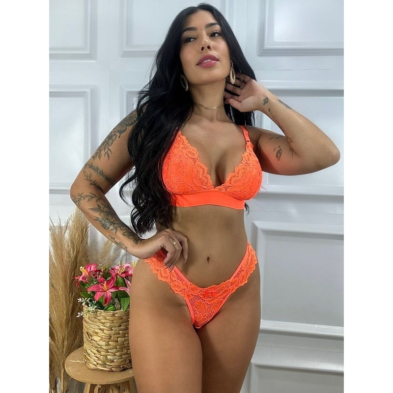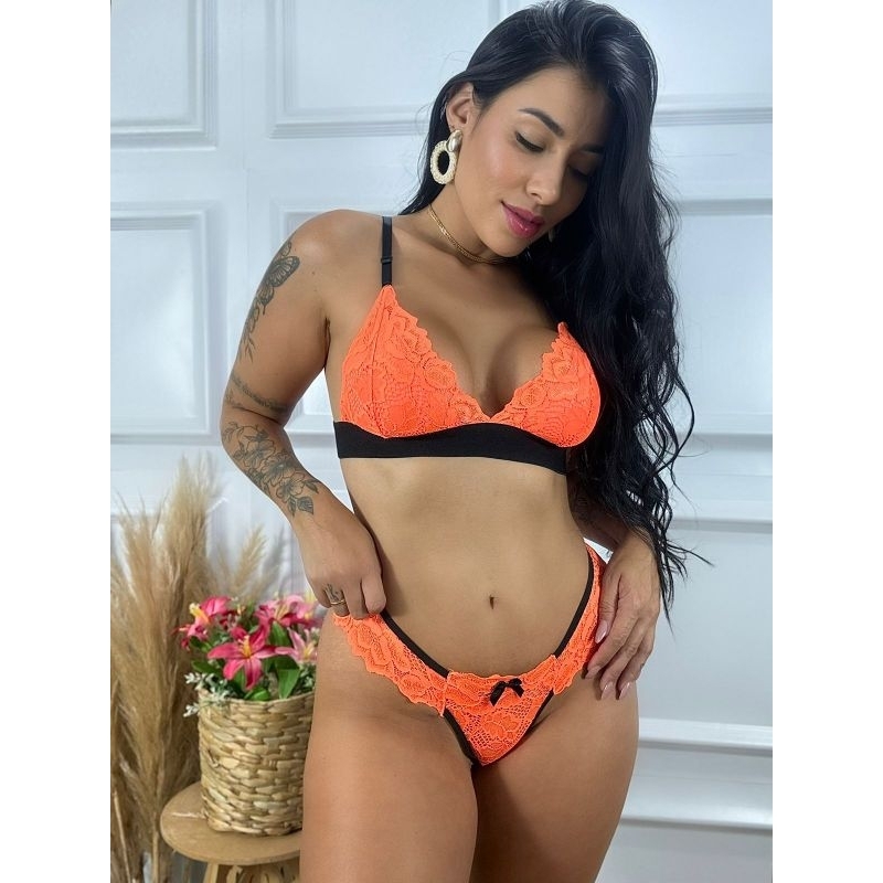 conjunto sexy lingerie sensual renda néon bicolor