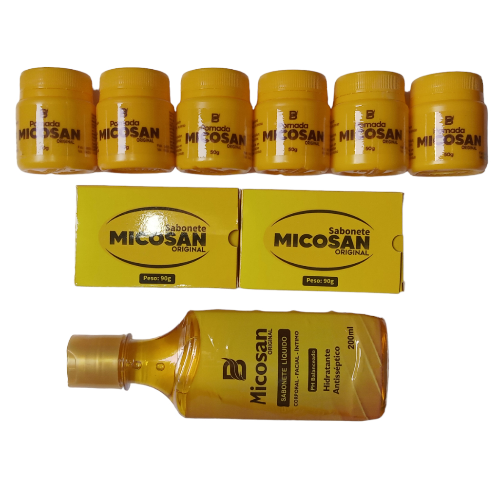 kit micosan 6 pomada 50g + 2 sab em barra + 1 sabonete liquido