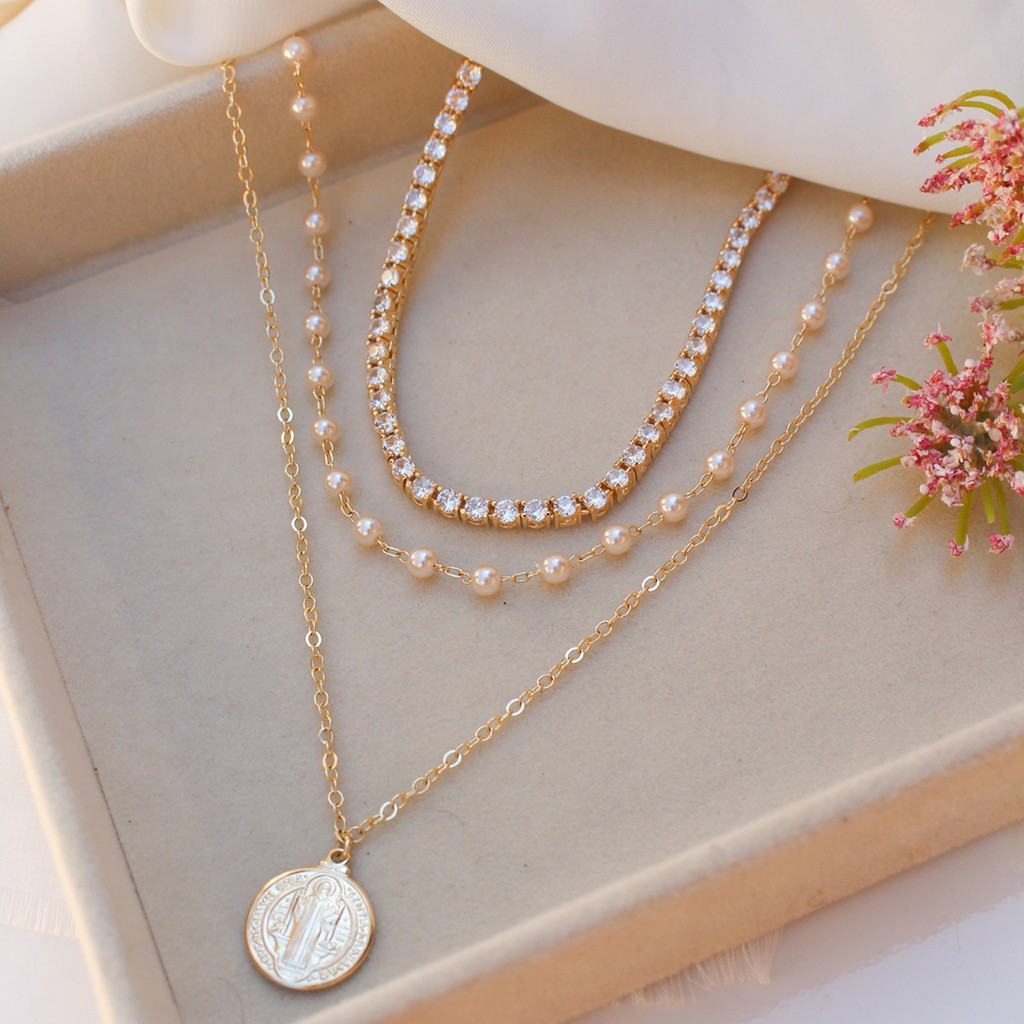 COLAR DE PÉROLAS MEDALHA SÃO BENTO FOLHEADO A OURO 18K