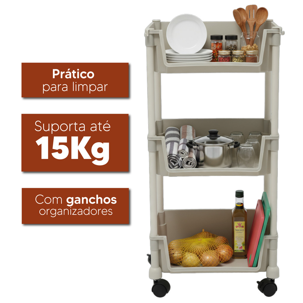 Carrinho Organizador Multiuso 3 Andares Cozinha Banheiro Bege