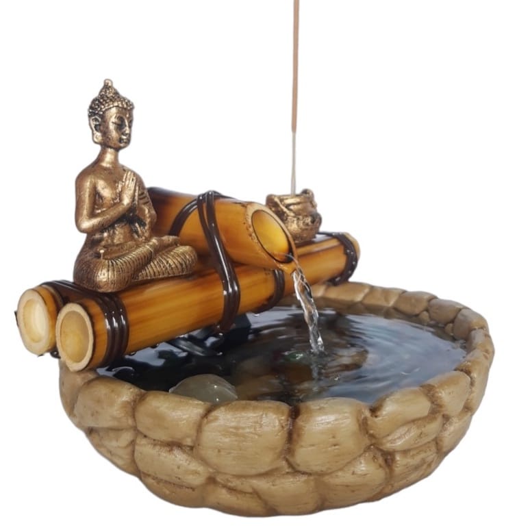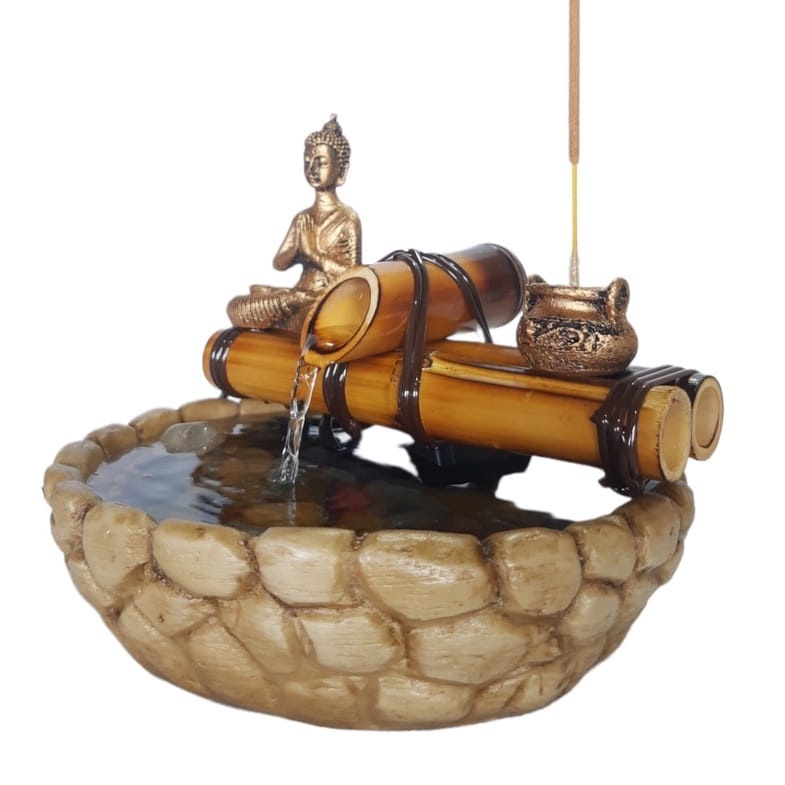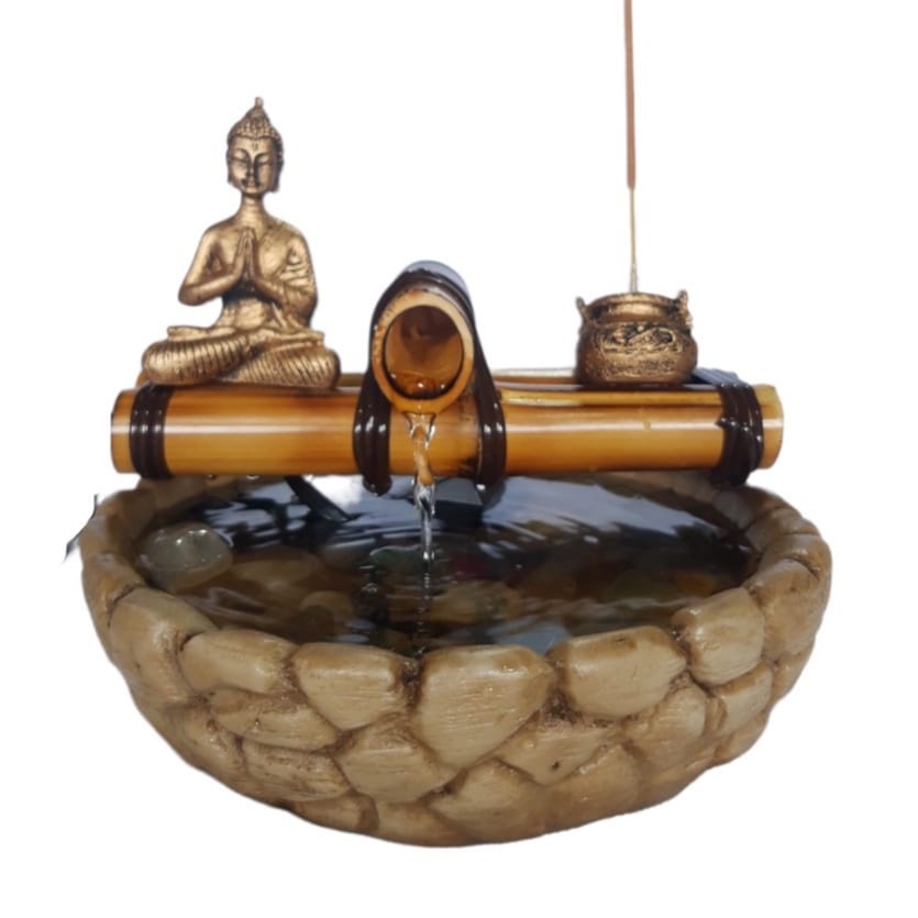 Mini Fonte de Agua queda Bambu com Buda Meditando e Incensário
