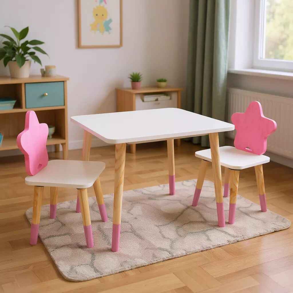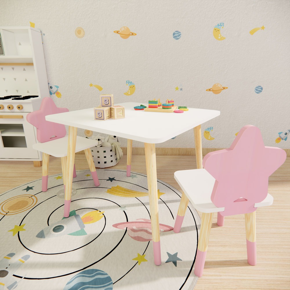 Conjunto Mesa Madeira Maciça Resistente 2 Cadeiras Estrela Infantil Kit Educativo