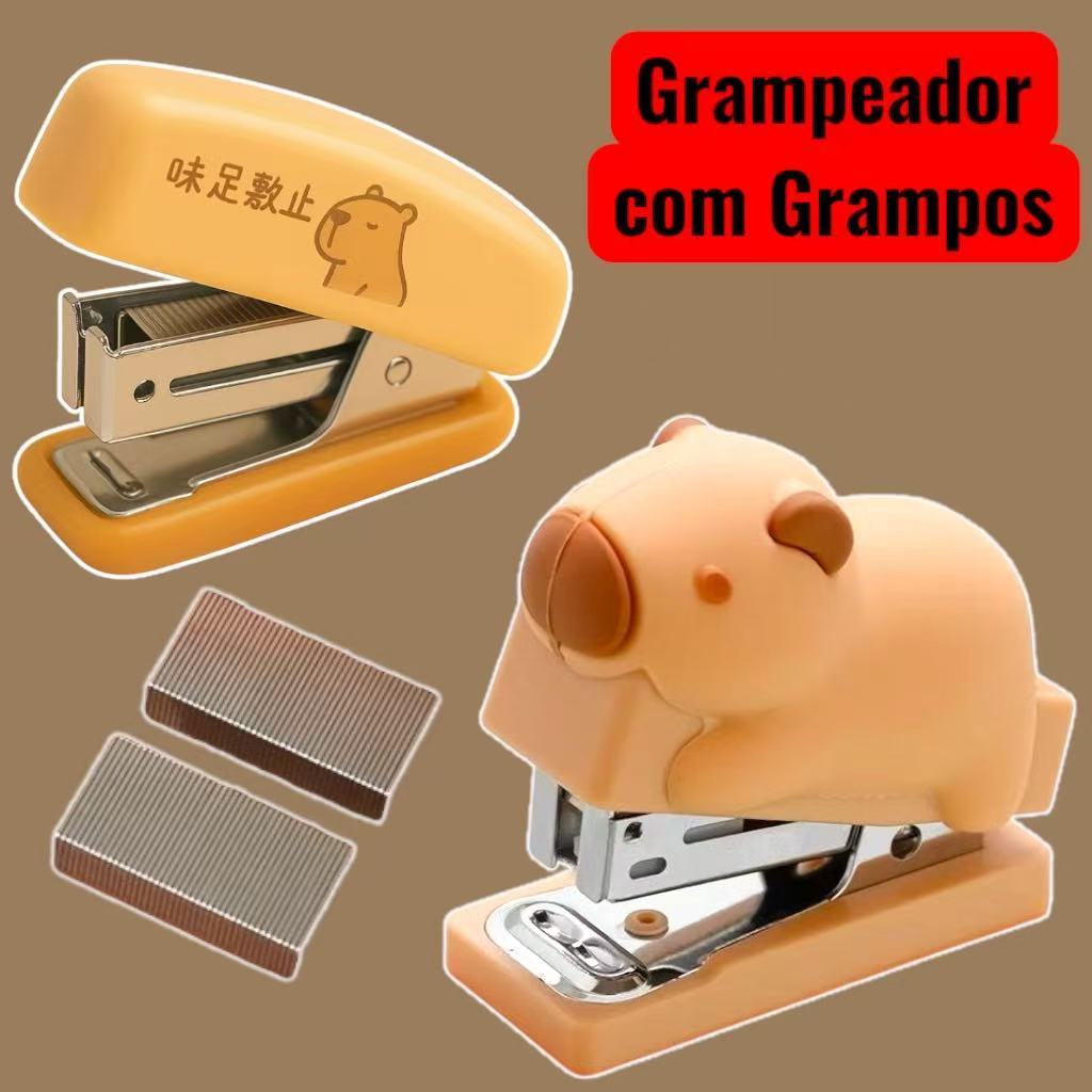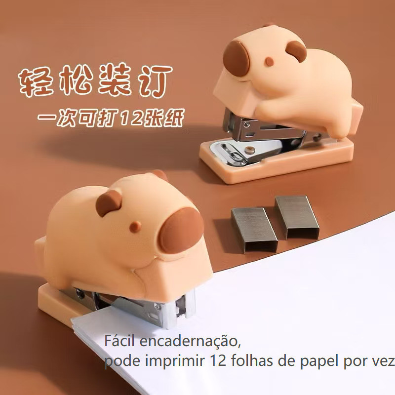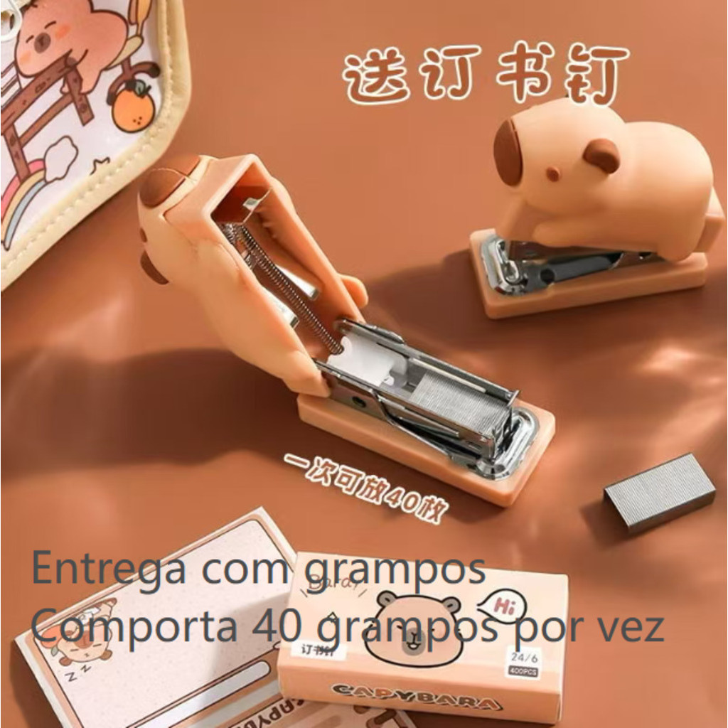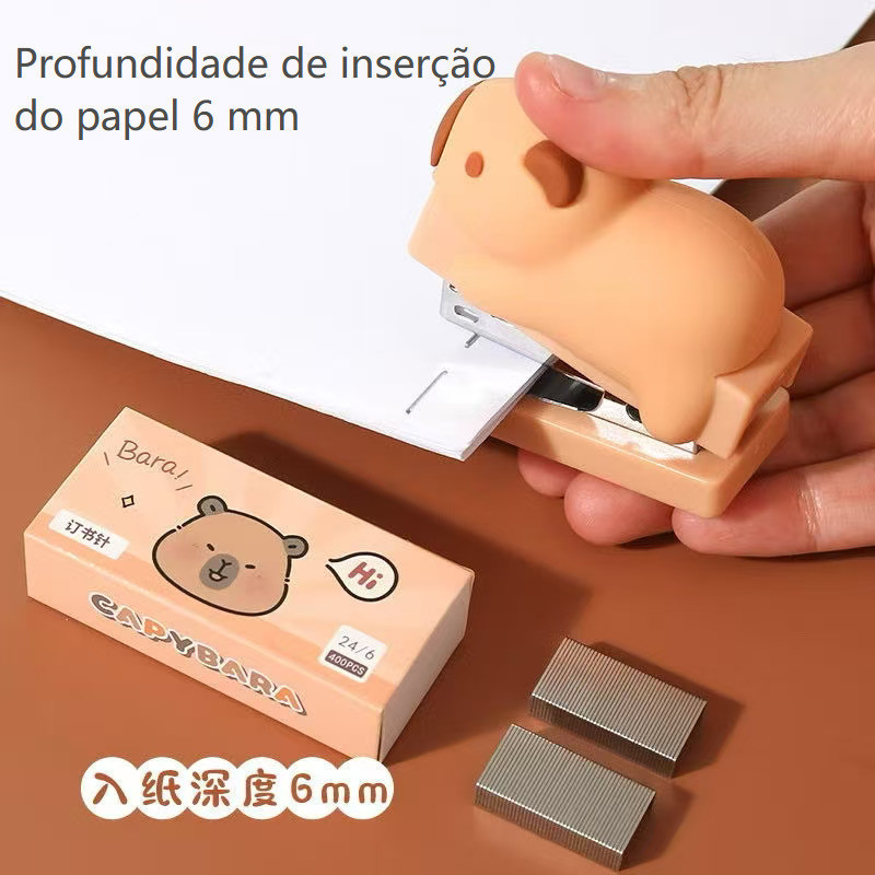 Grampeador Escritório + Grampos Capivara Papelaria Fofa Kwaii 400 Grampos 24/6 Ou 26/6