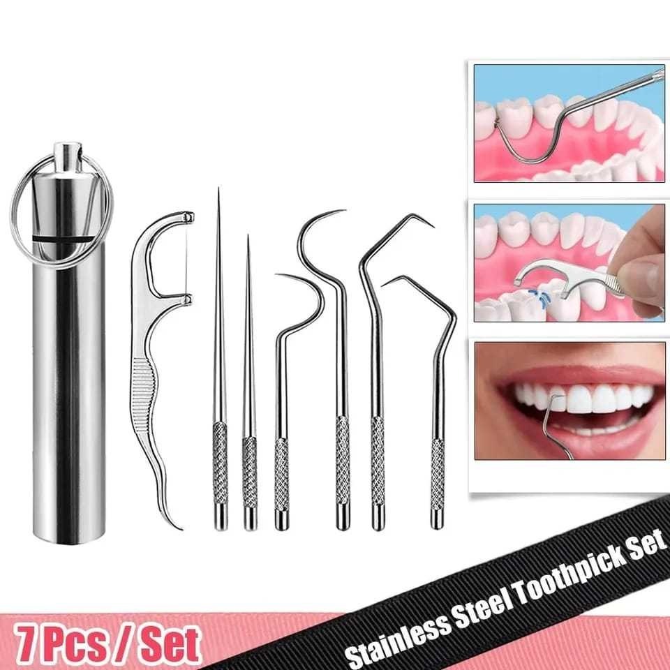 Conjunto 7 peças para Higiene Bucal Palitos de Dentes Aço inoxidável reutilizável.