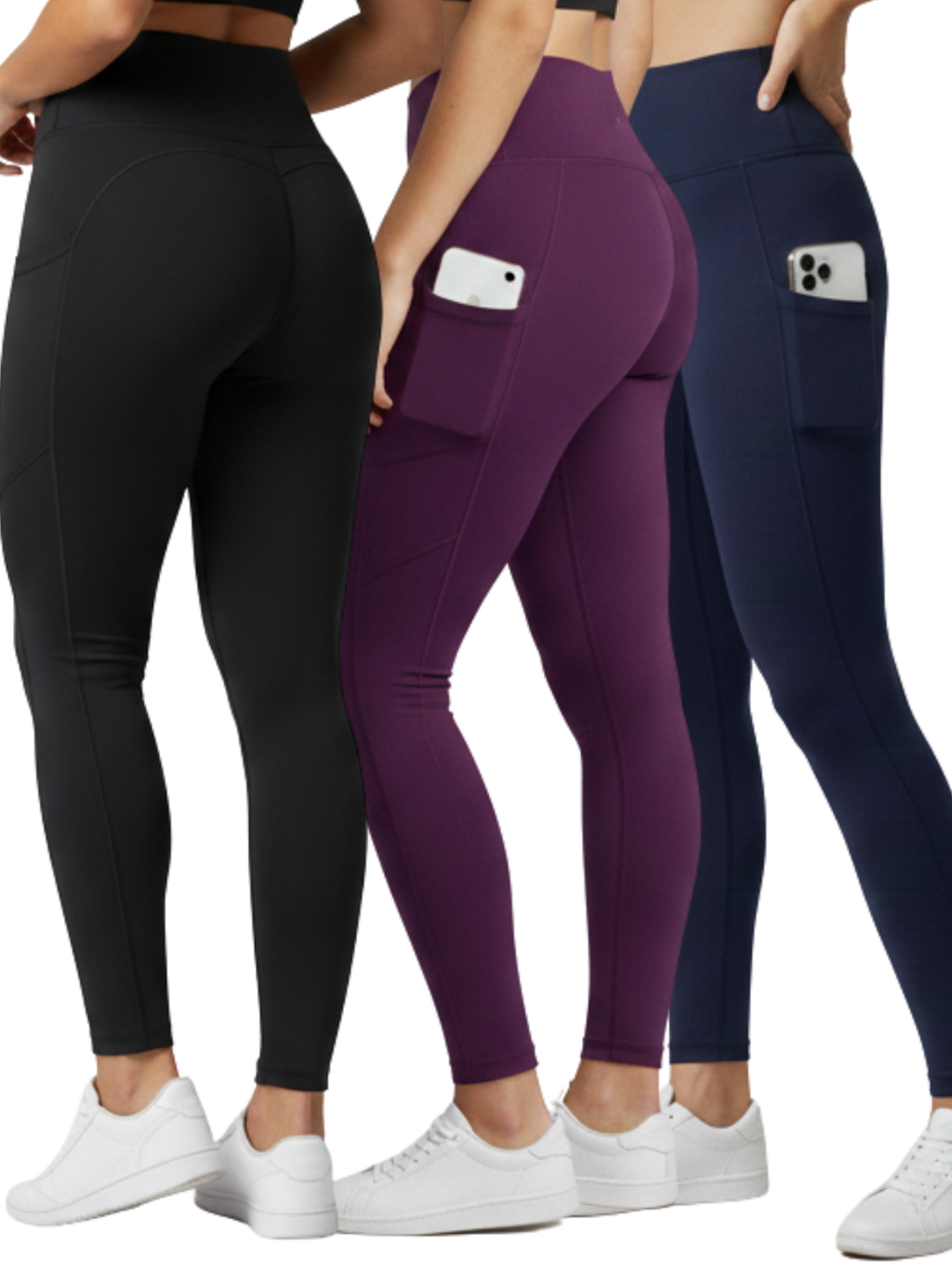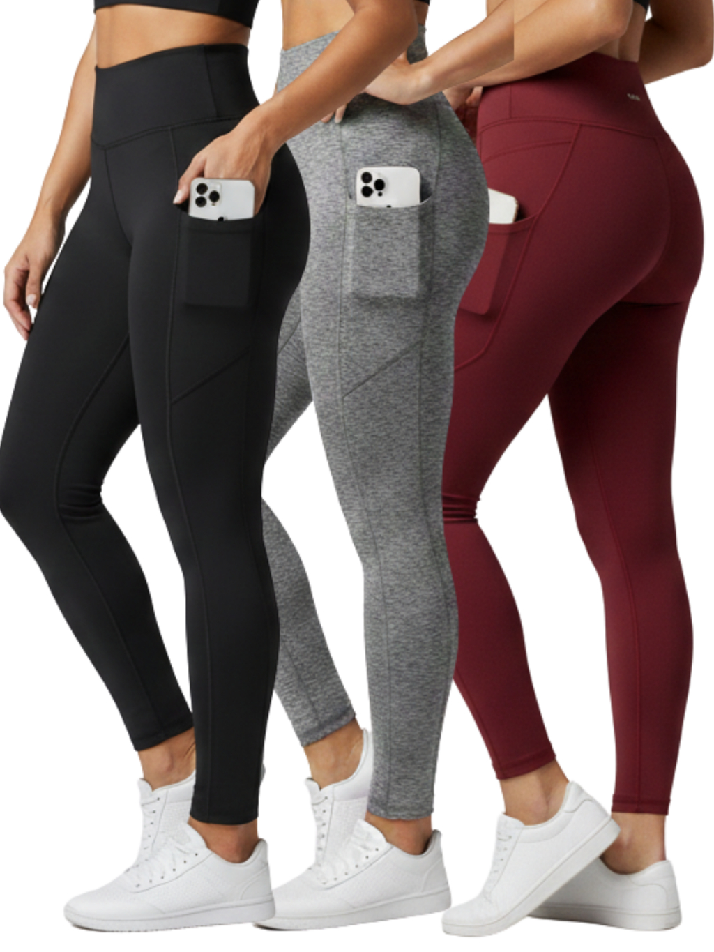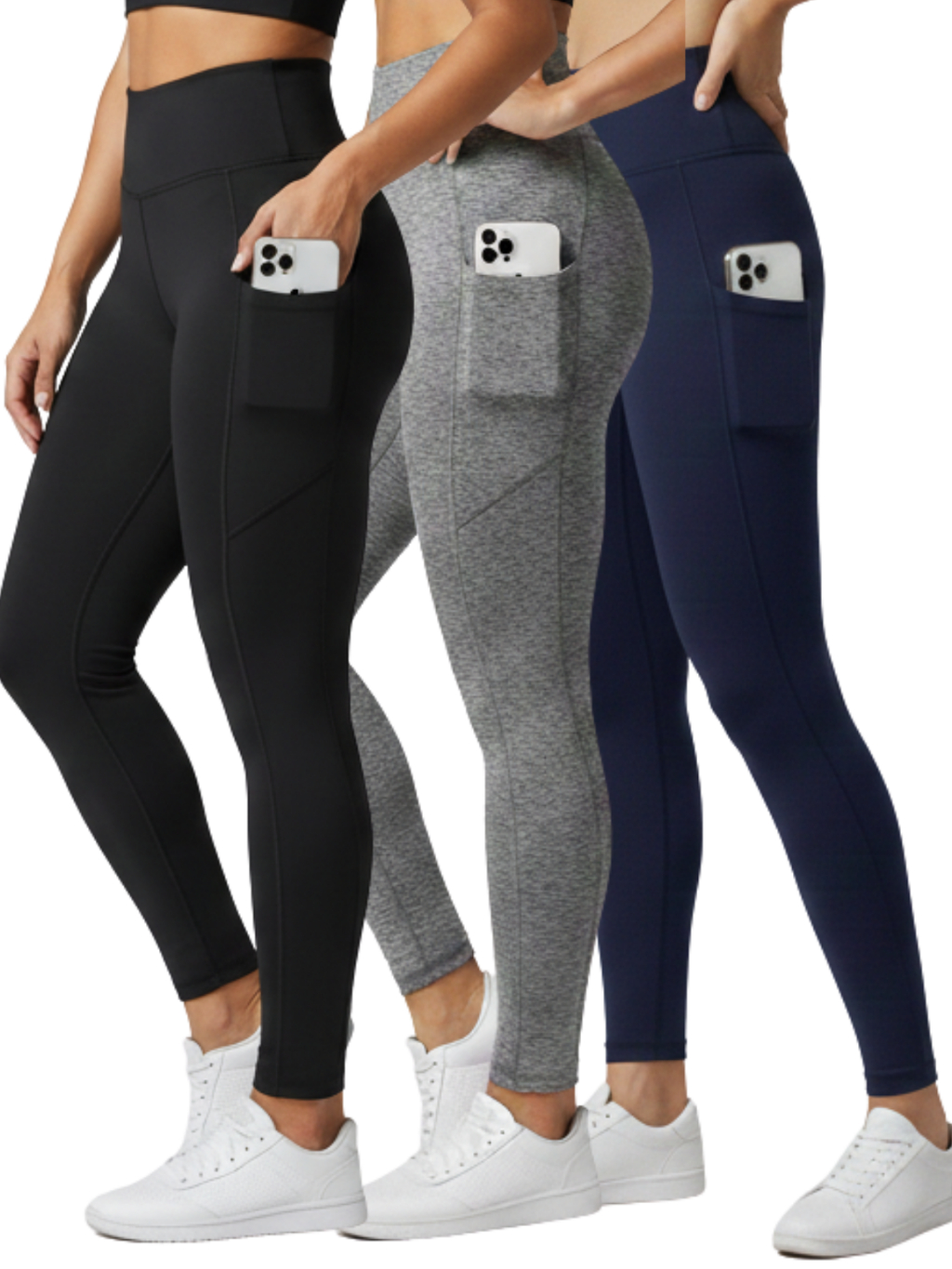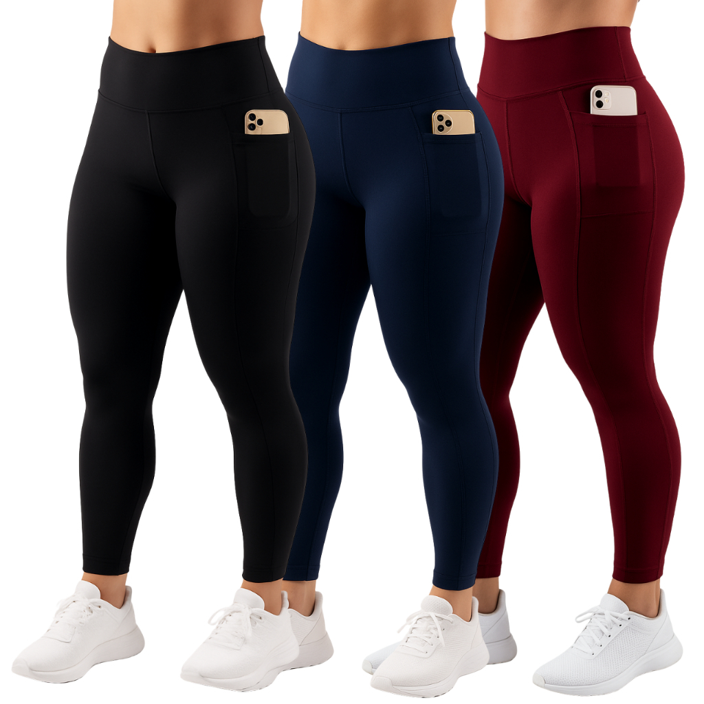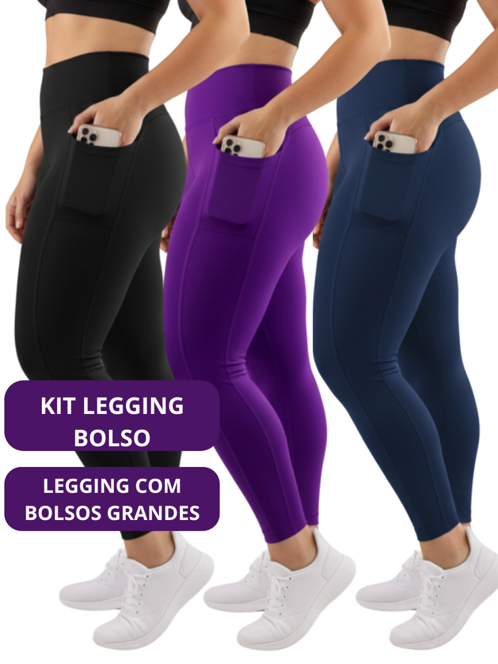 Kit 3 Calça Legging Feminina com Bolso Lateral Fitness Cós alto Esportiva ideal guardar objetos