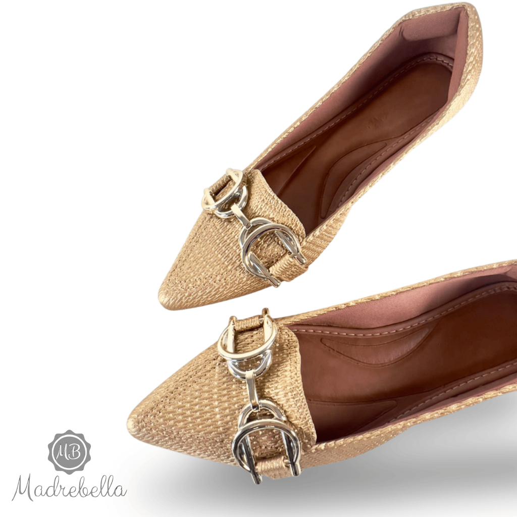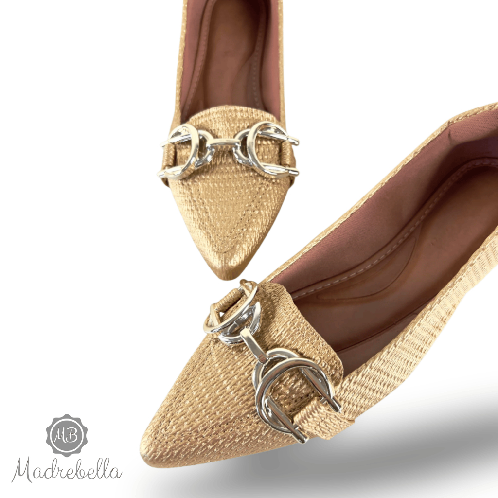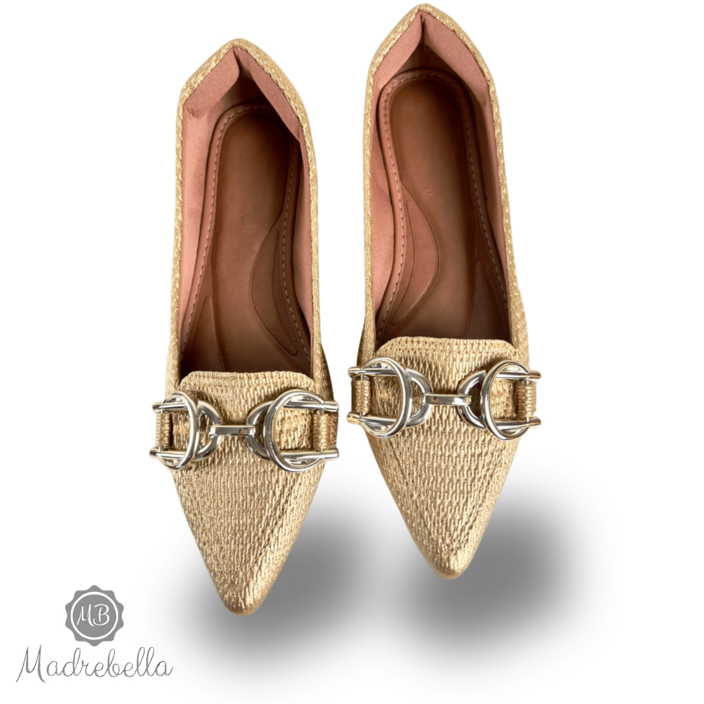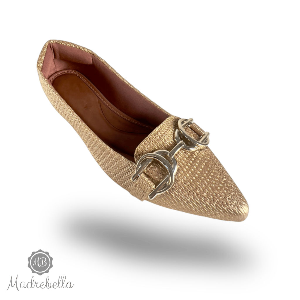 Sapatilha Feminina Bico Fino Pele Ouro Enfeite Metalico Duplo | Sophia - chique, clássica, Elegante