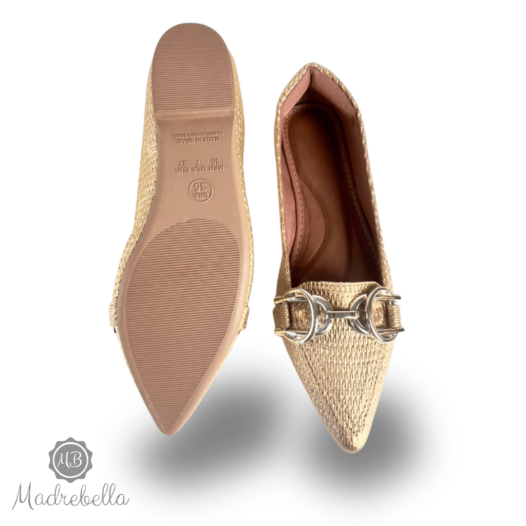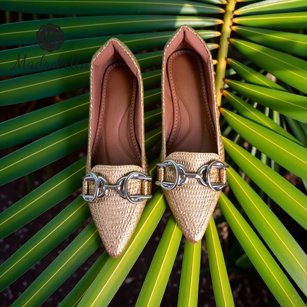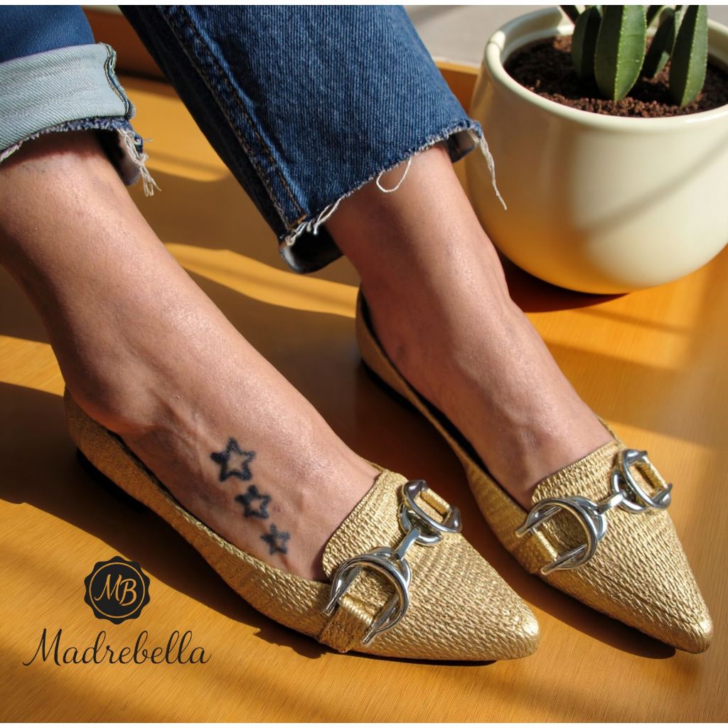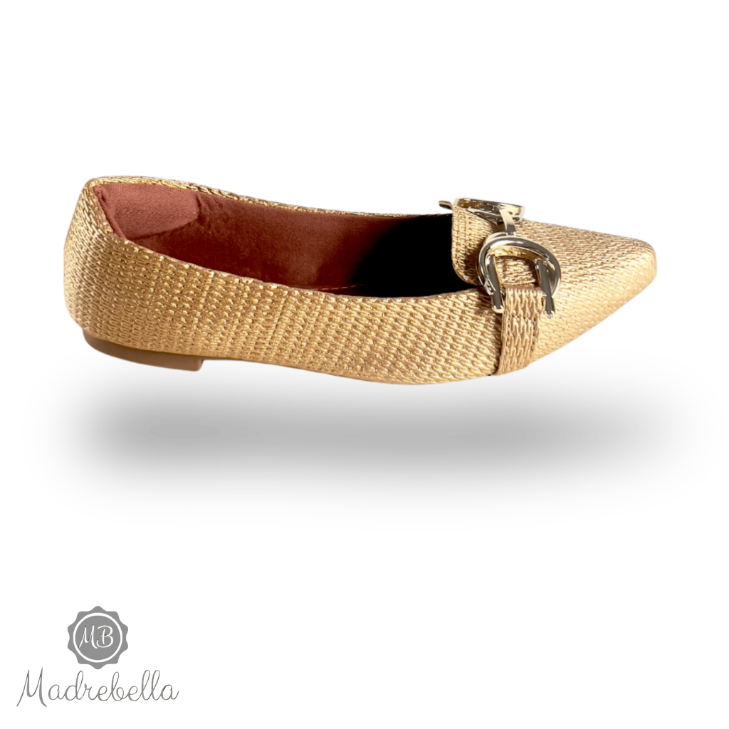Sapatilha Feminina Bico Fino Pele Ouro Enfeite Metalico Duplo | Sophia - chique, clássica, Elegante