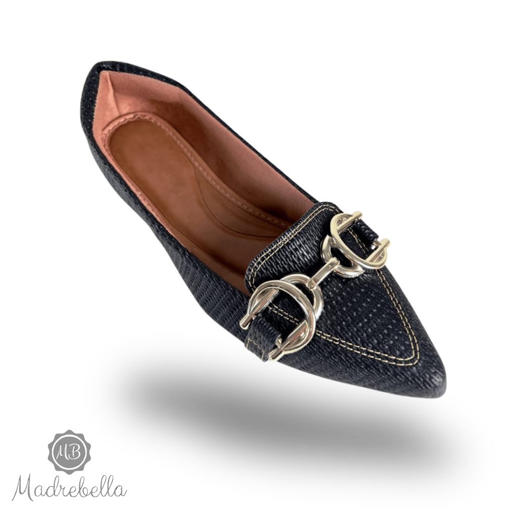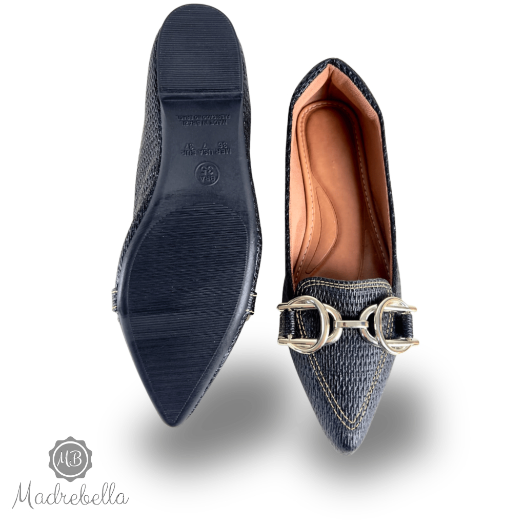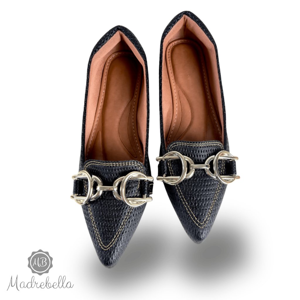 Sapatilha Feminina Bico Fino Pele Preto Enfeite Metalico Duplo | Sophia - chique, clássica, básica