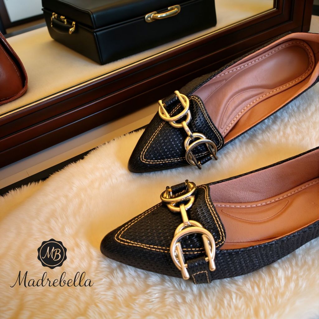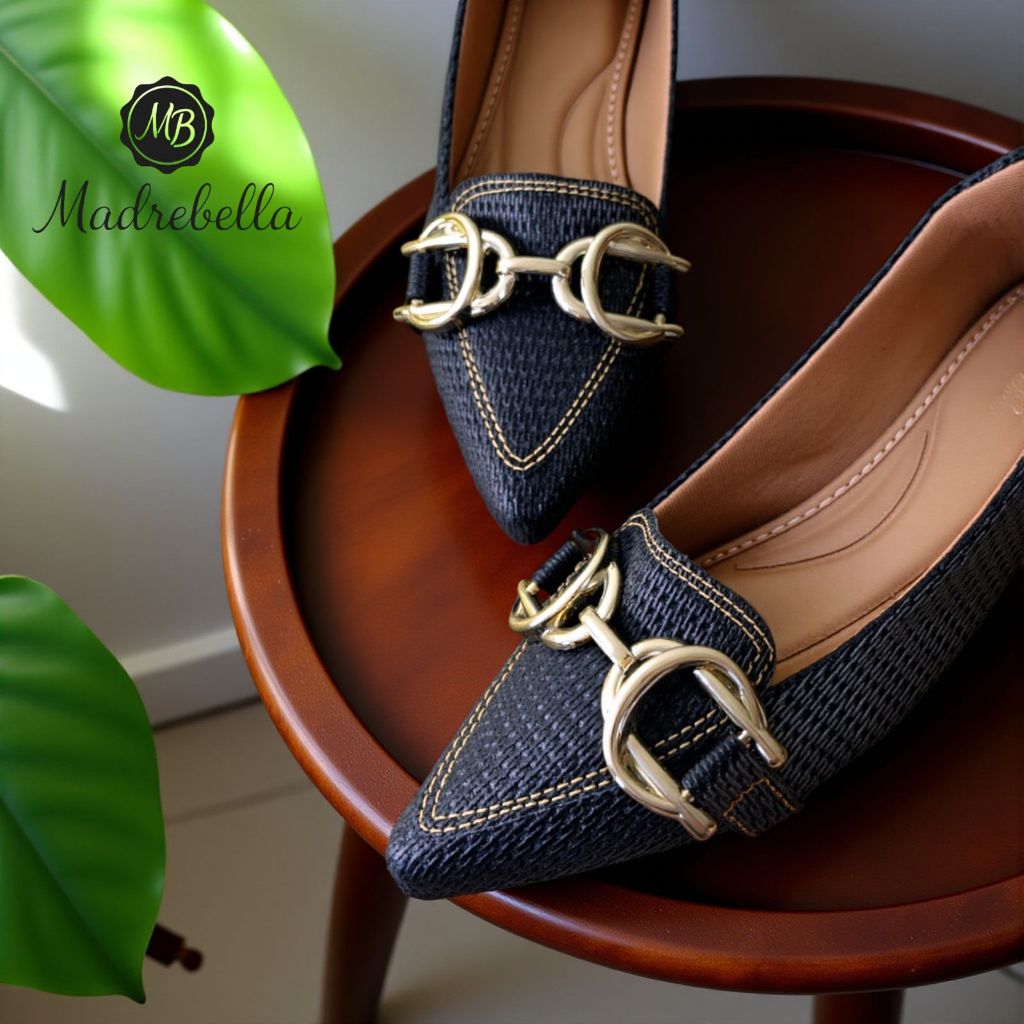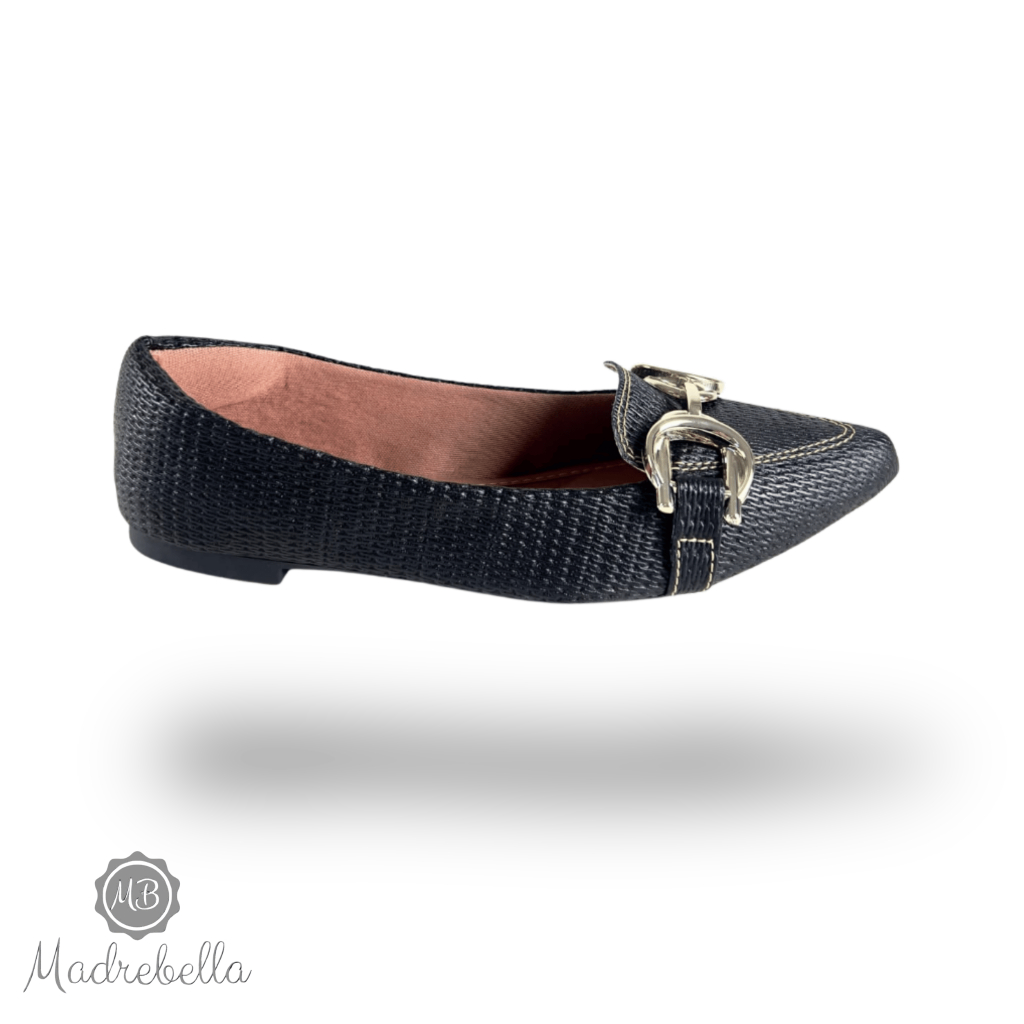 Sapatilha Feminina Bico Fino Pele Preto Enfeite Metalico Duplo | Sophia - chique, clássica, básica