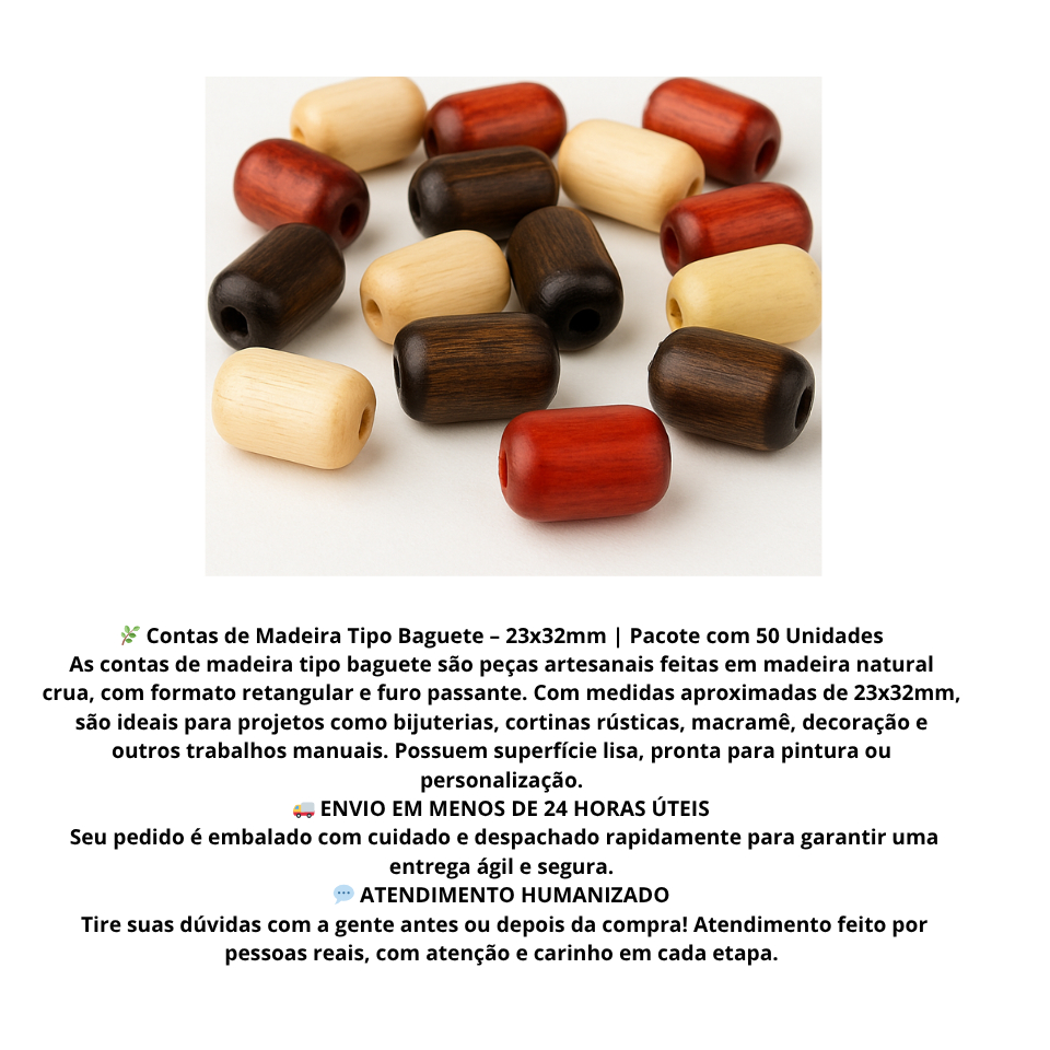Contas de Madeira Baguete 23x32mm(Grande) | Kit c/ 50 Peças | Rústico, Artesanal e Versátil