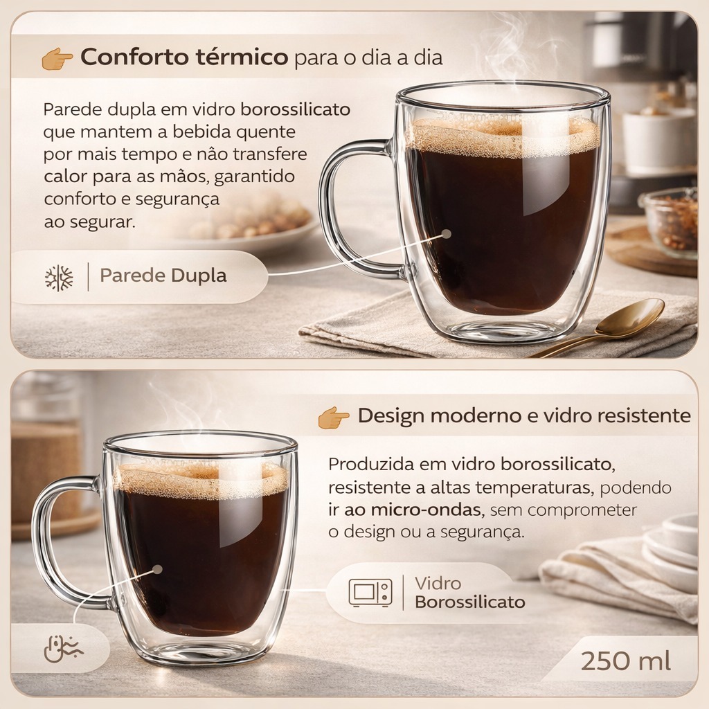 Kit 6 Xícaras de Vidro com Parede Dupla Resistente 250 ML