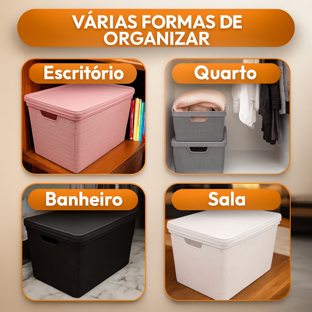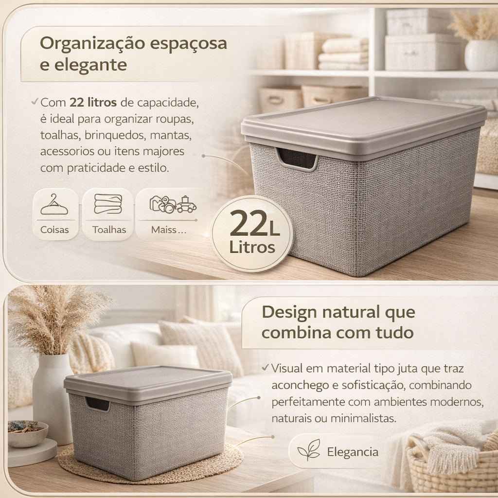 Kit 2 Caixas Organizadoras com Tampa 22 Litros Cesto em Plástico Resistente Cinza