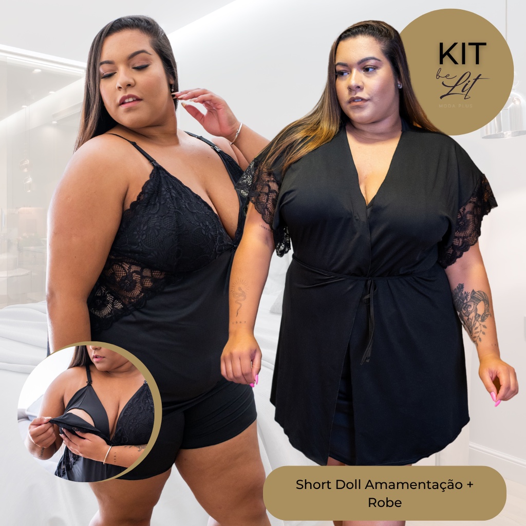 KIT 2 Peças - Robe e Short Doll Amamentação Plus Size 50 52 54 56 58 Conforto Renda Pijama Roupa de Dormir BeLIT MODAS