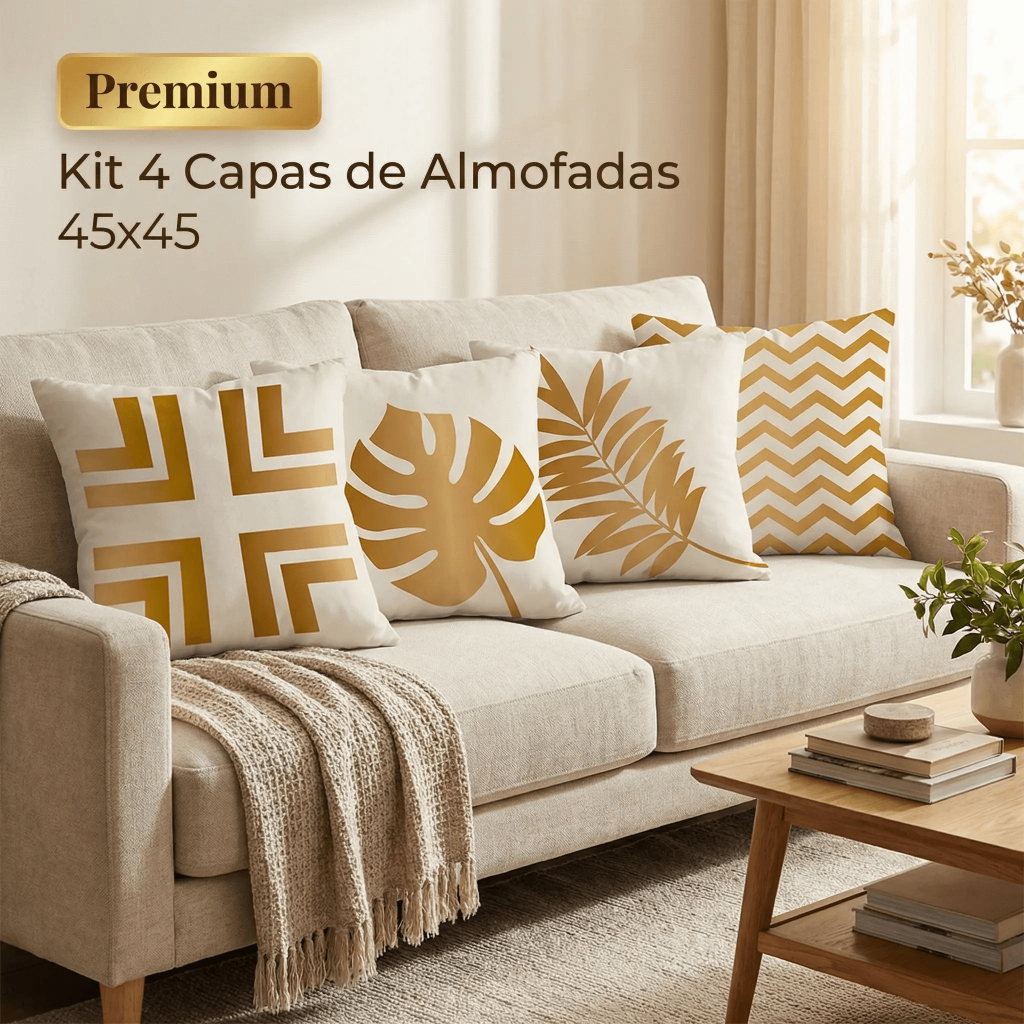 Kit 4 Capas de Almofada Decorativas Folhagens Douradas 45x45 cm