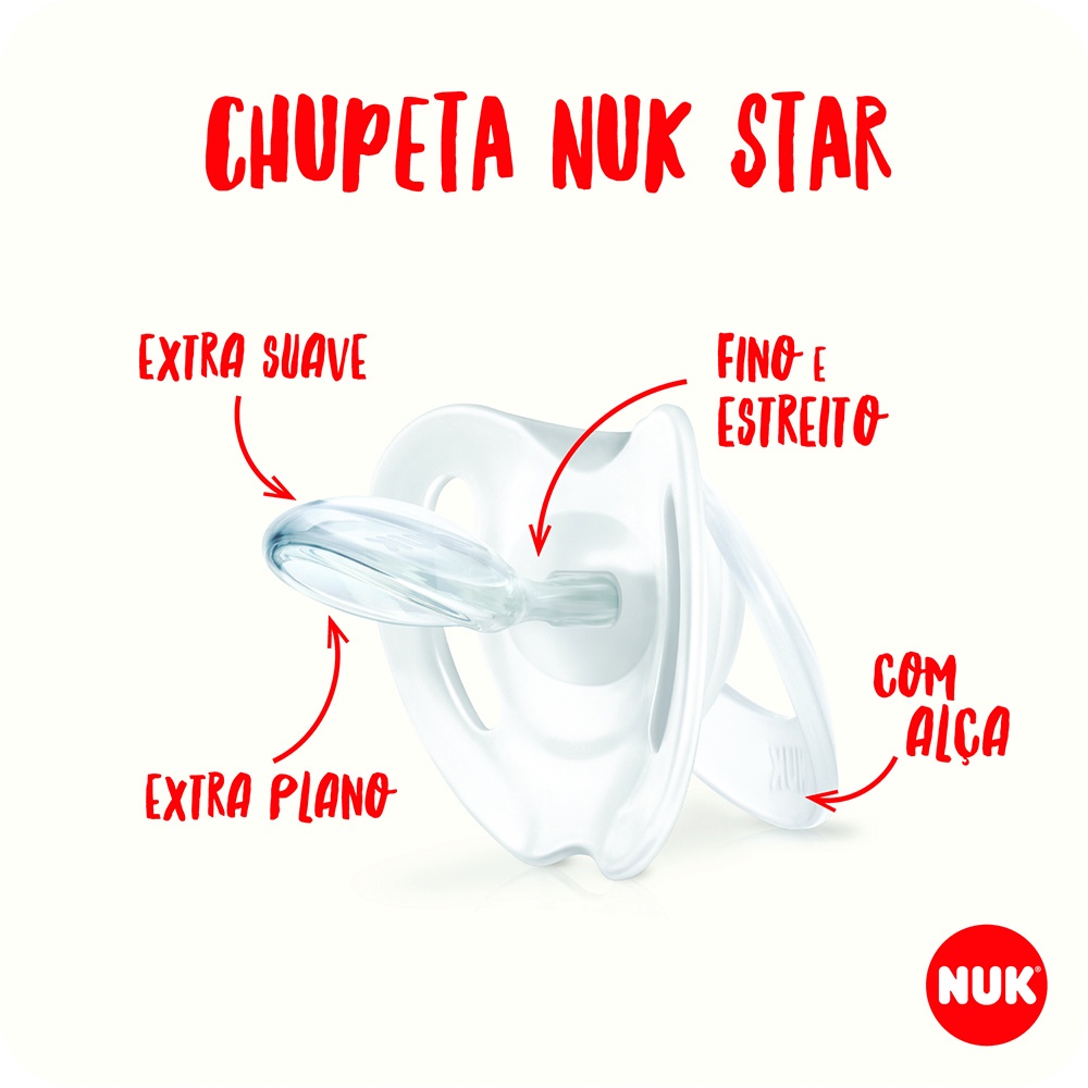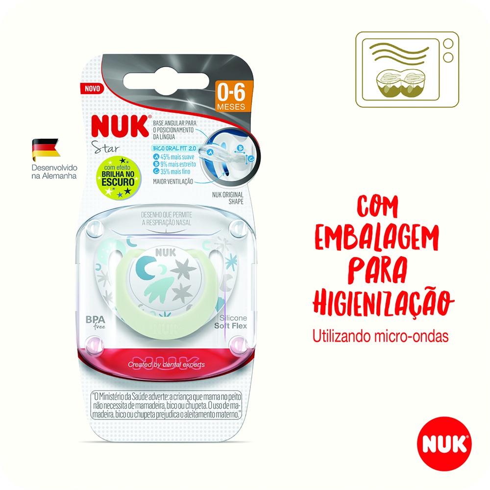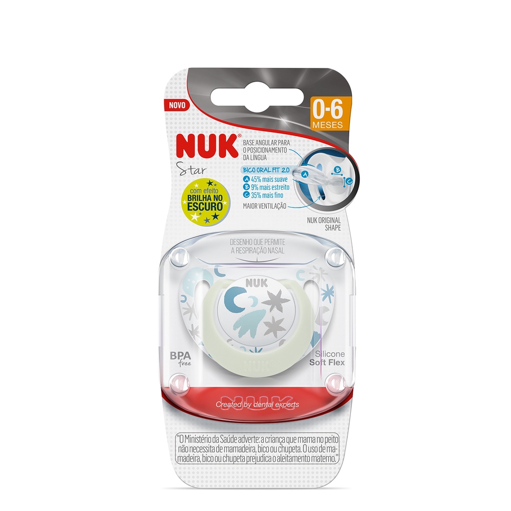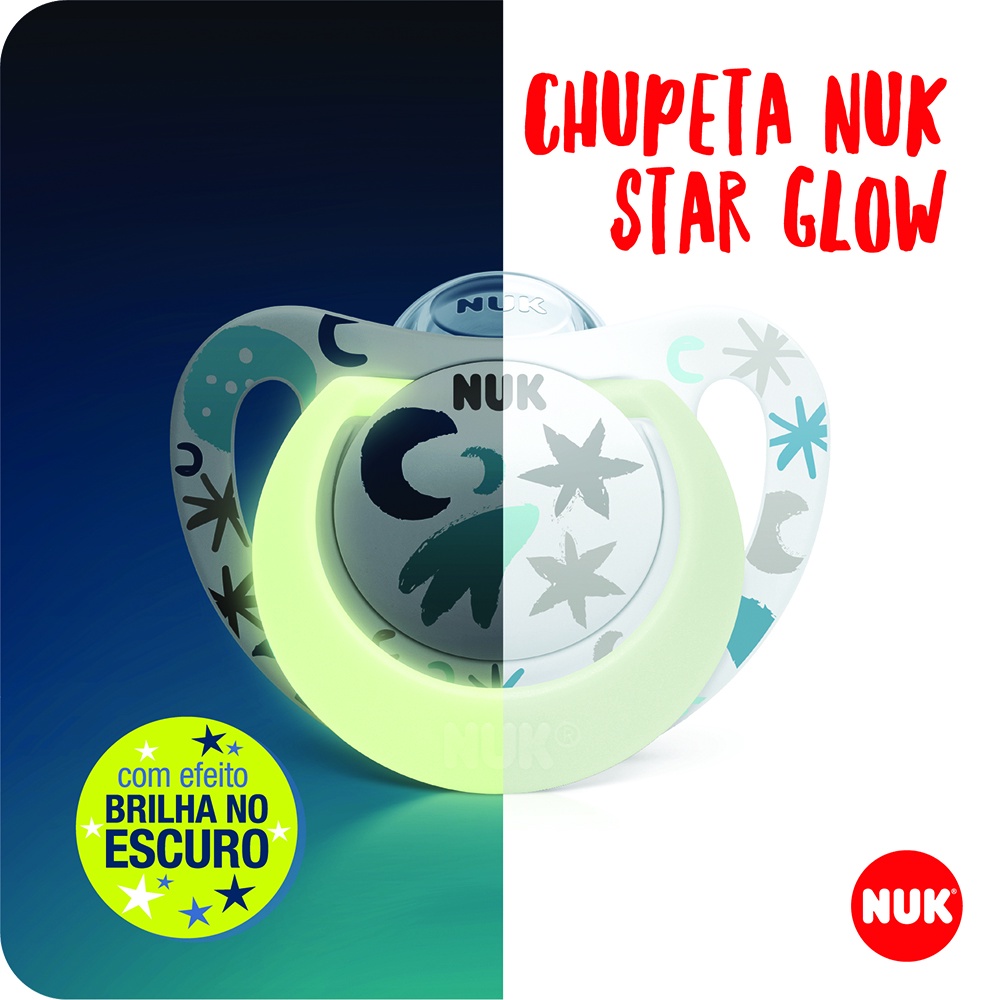 CHUPETA NUK FASE 1 DE 0 A 6 MESES STAR GLOW NEUTRAL BRILHA NO ESCURO SILICONE ORTO