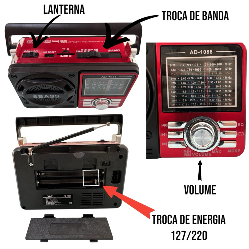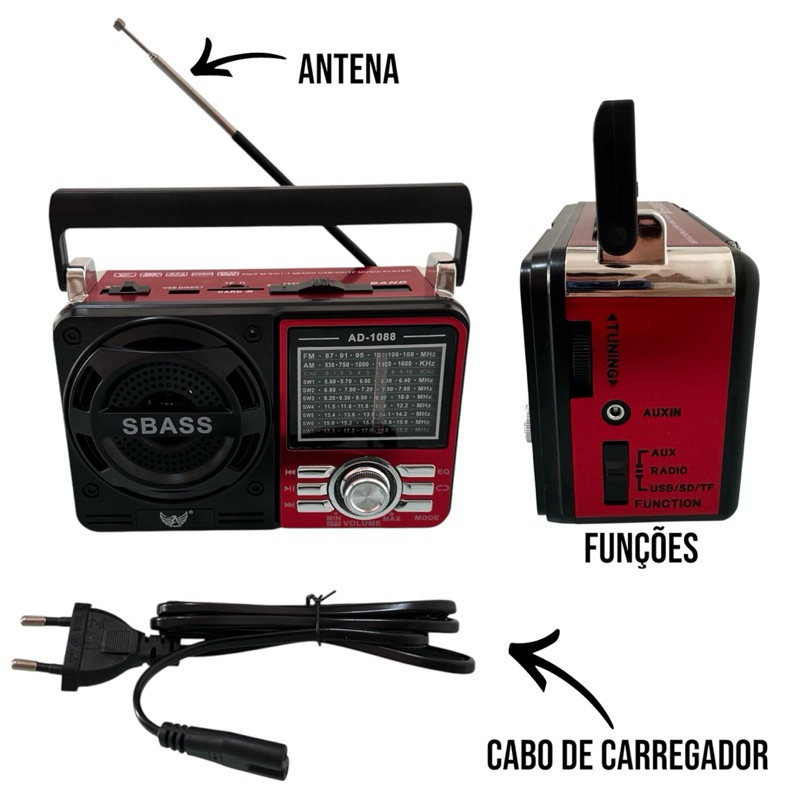 rádio retrô modelo 1088 energia e pilha
