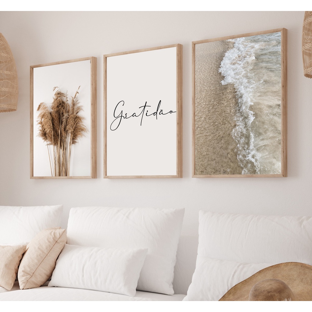 Kit 3 Quadros Decorativos Capim Dos Pampas Gratidão Frase Mar Moderno Moldura