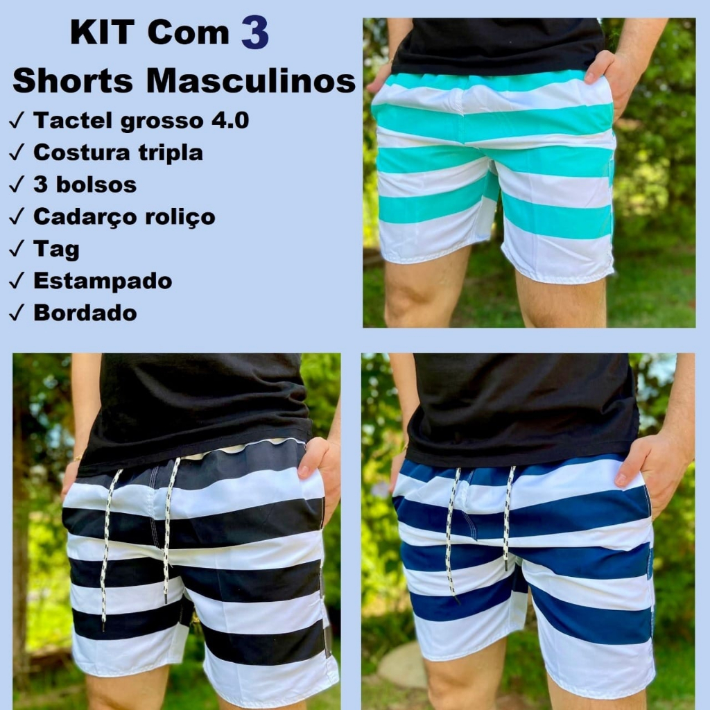 Kit 3 Short Bermuda Masculino Tactel Moda Praia Verão - Envio Rápido