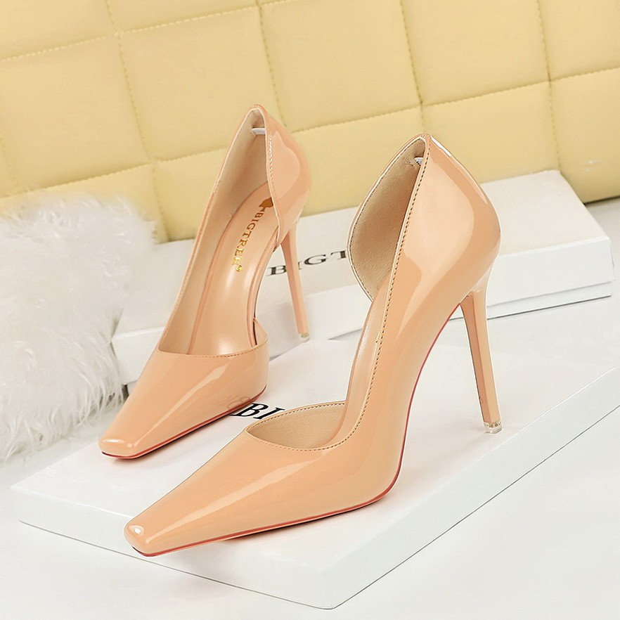 Sapatos Femininos de Salto Alto BIGTREE Estilo Coreano Sexy 3287-1 Stiletto Simples Couro Patente Brilhante Bico Quadrad