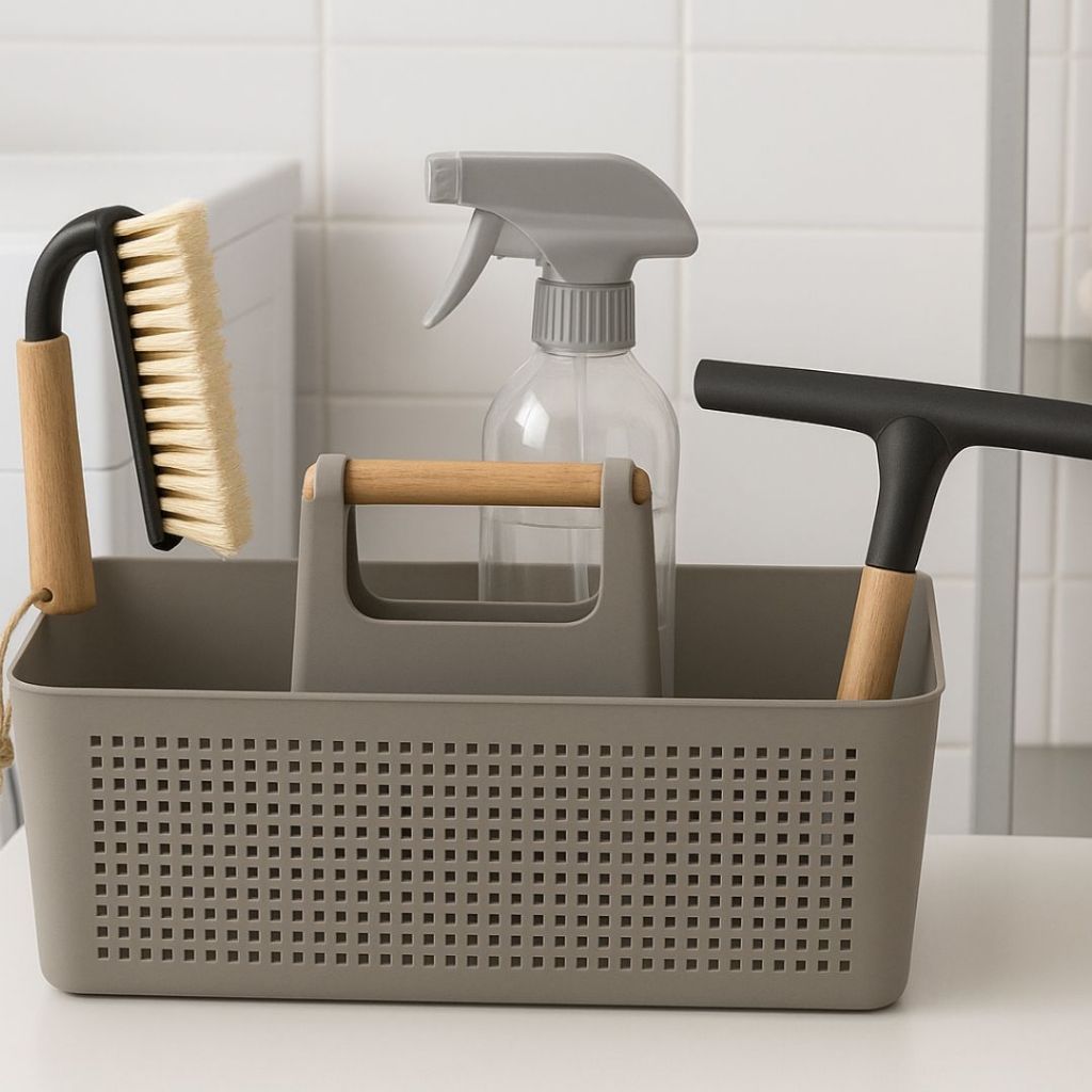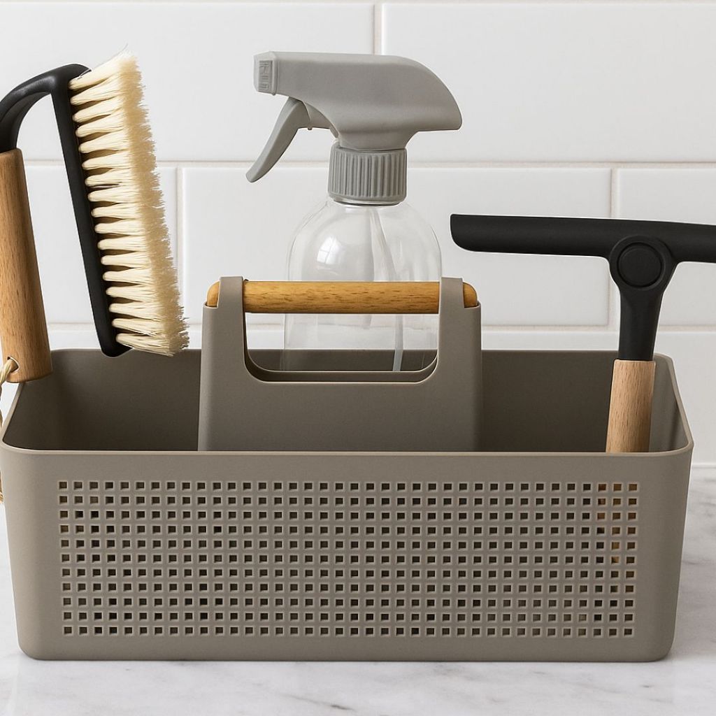 Kit 4 Peças Organizador com borrifador, Rodo E Escova Multiuso Cinza