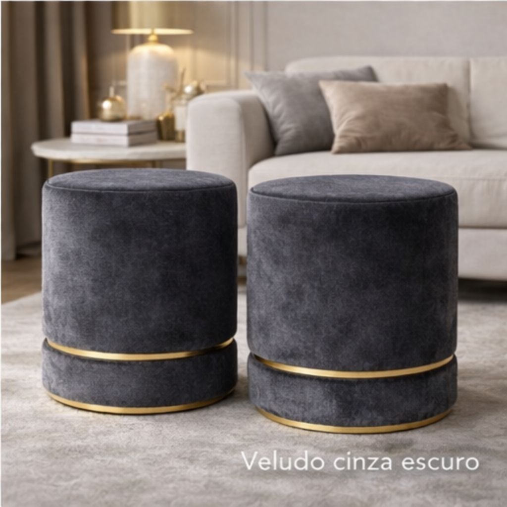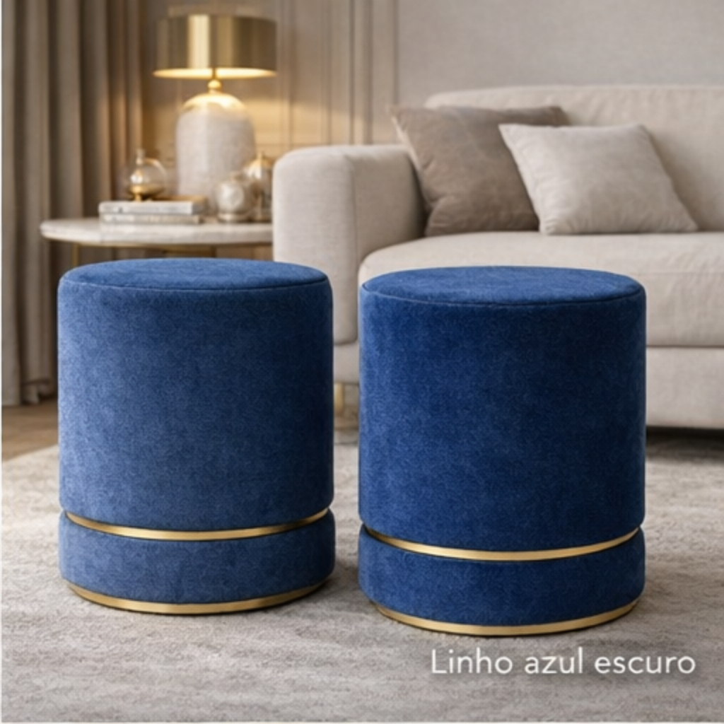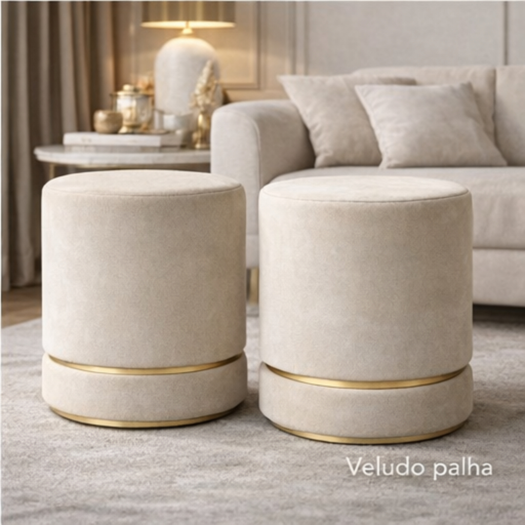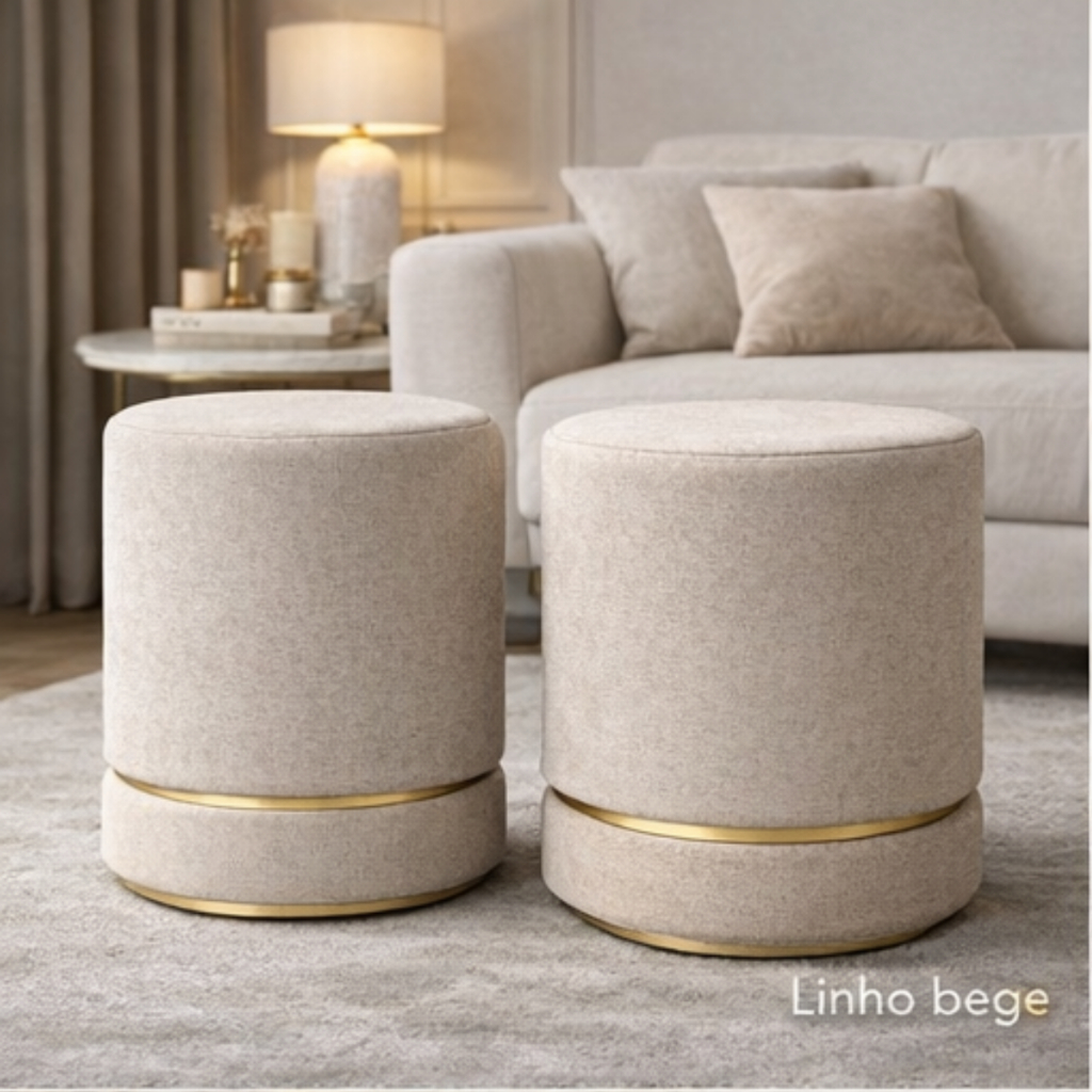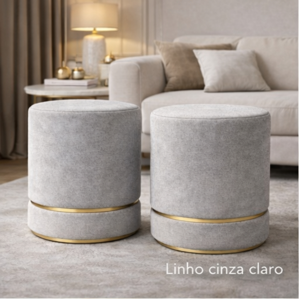 Kit 2 Puff Decorativo Redondo 42cm Suede ou Linho com Cinta Dourada – Puff Sala Quarto Moderno Reforçado