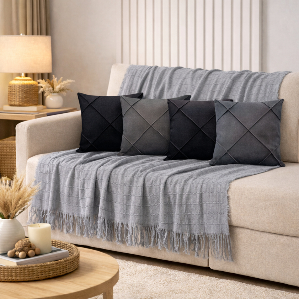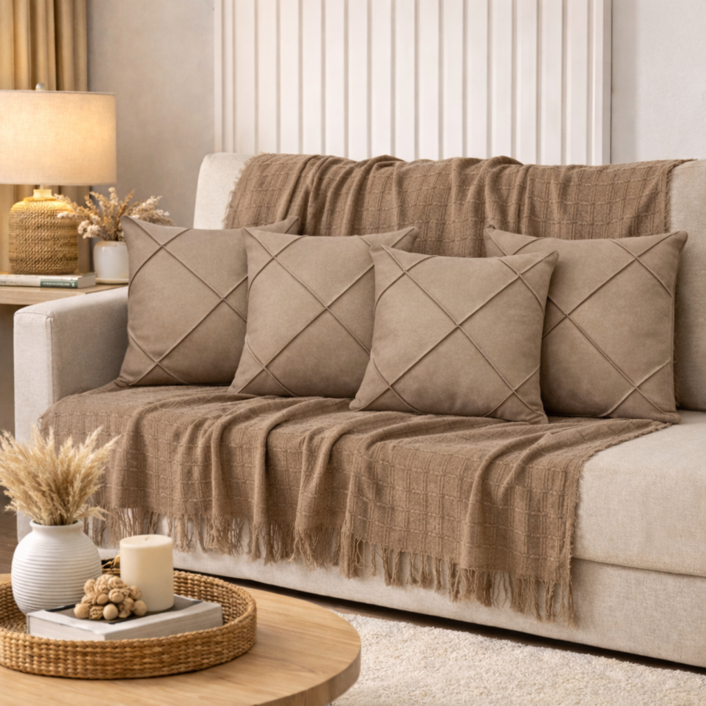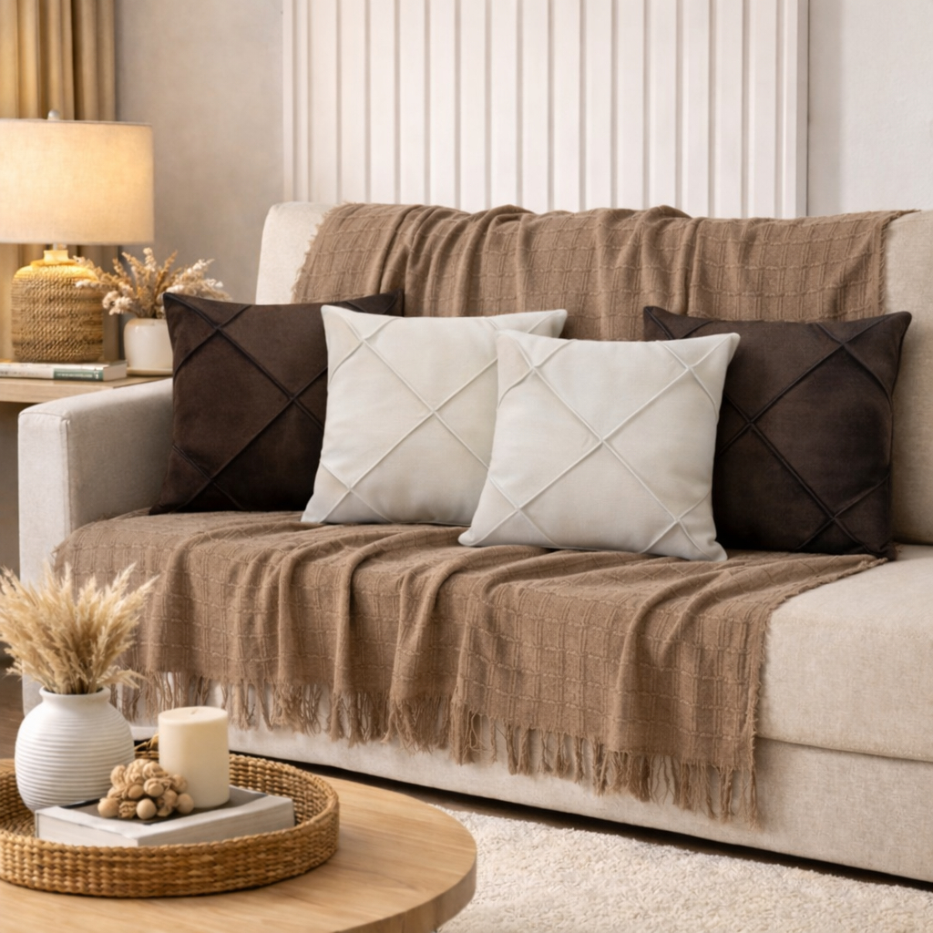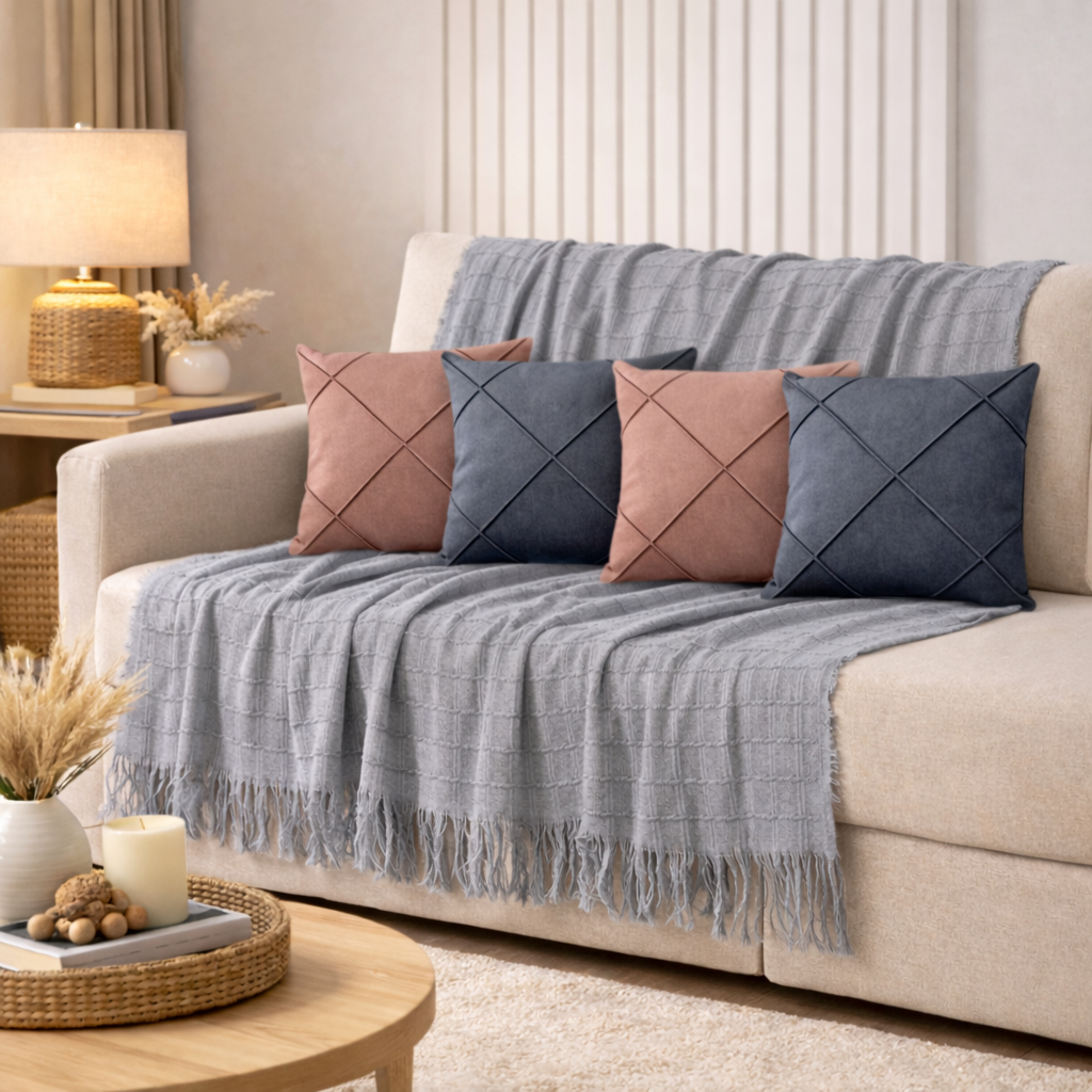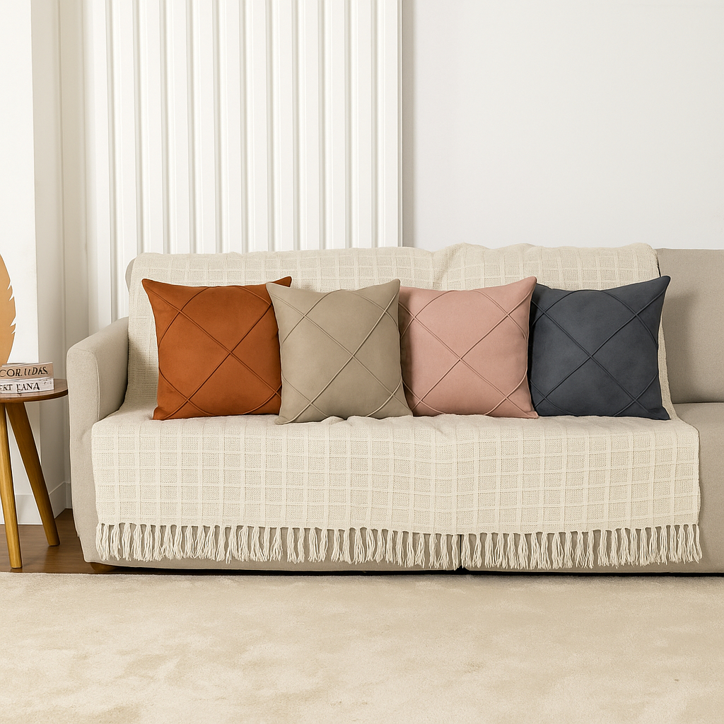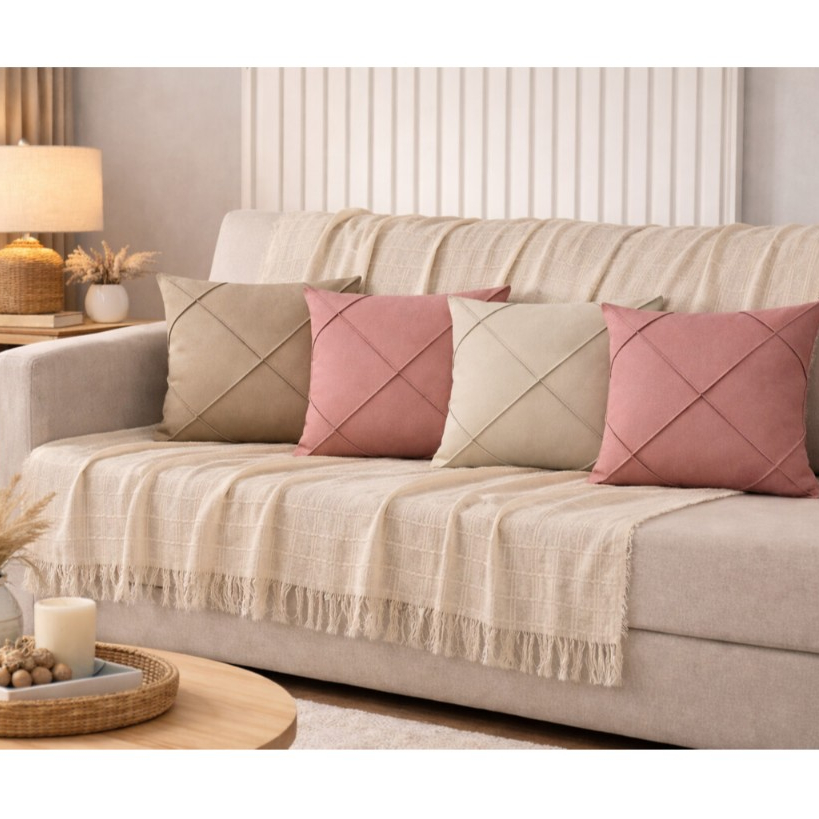 Kit Manta + Capas de Almofada Sued Drapeada Decoração Sala Sofá Manta P 1,40 x 1,70m