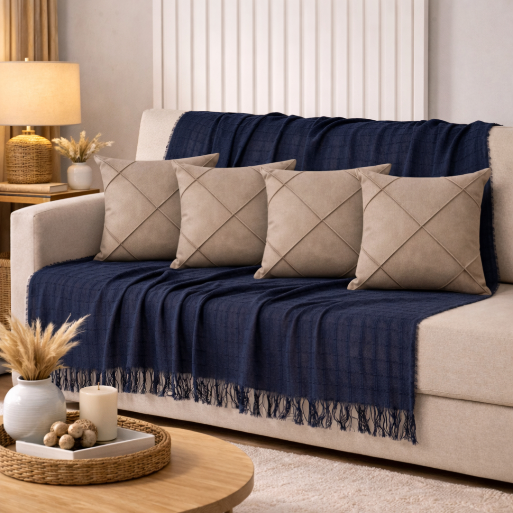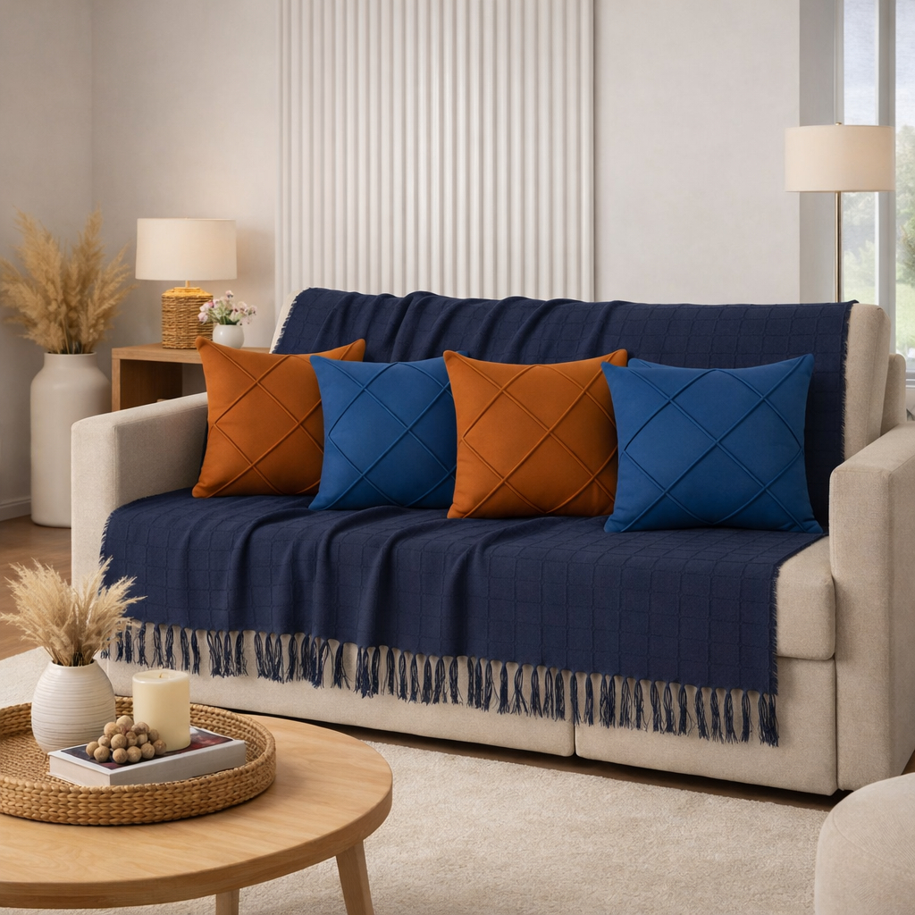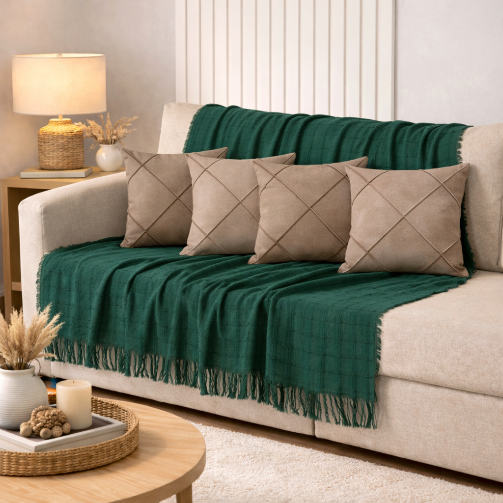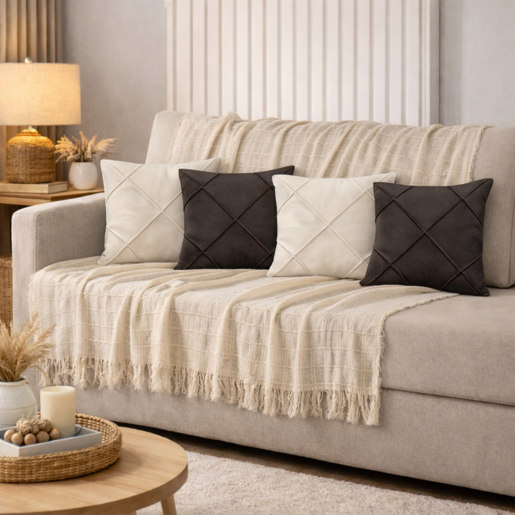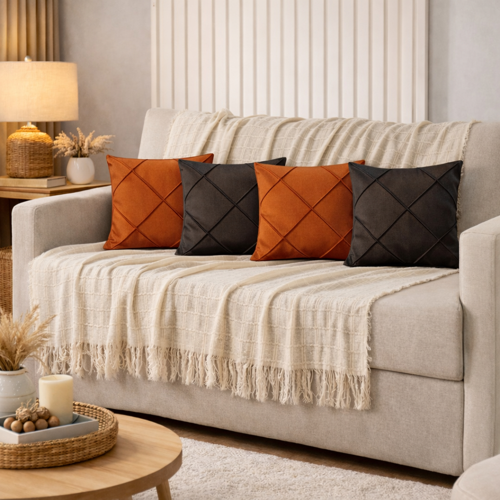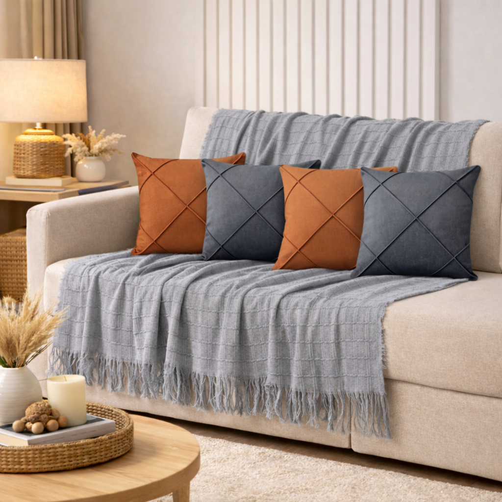 Kit Manta + Capas de Almofada Sued Drapeada Decoração Sala Sofá Manta P 1,40 x 1,70m