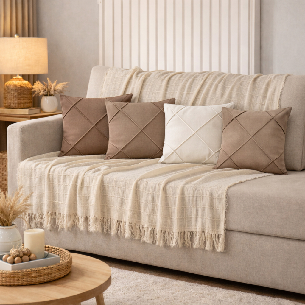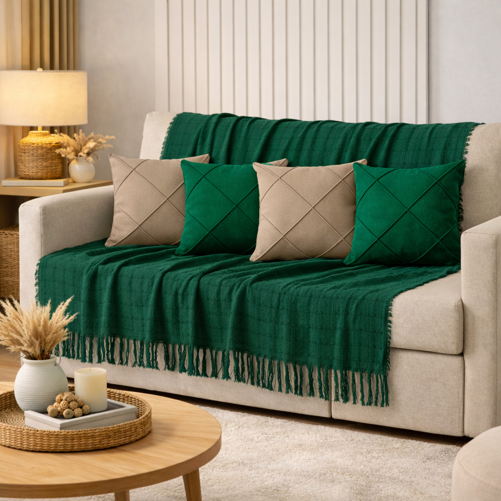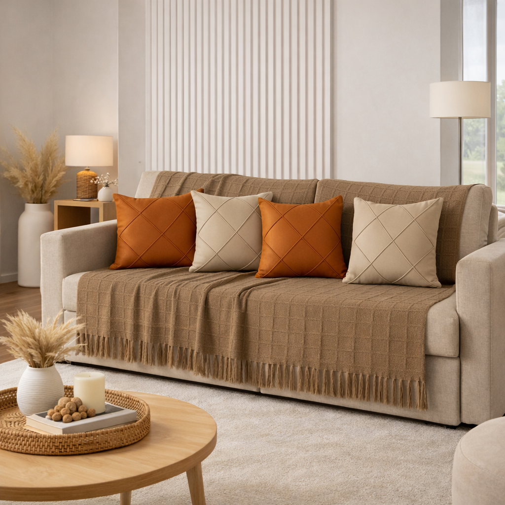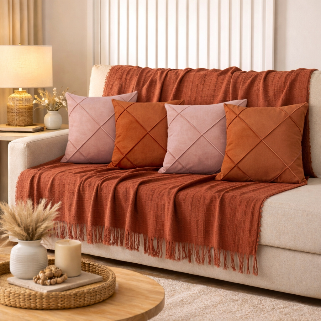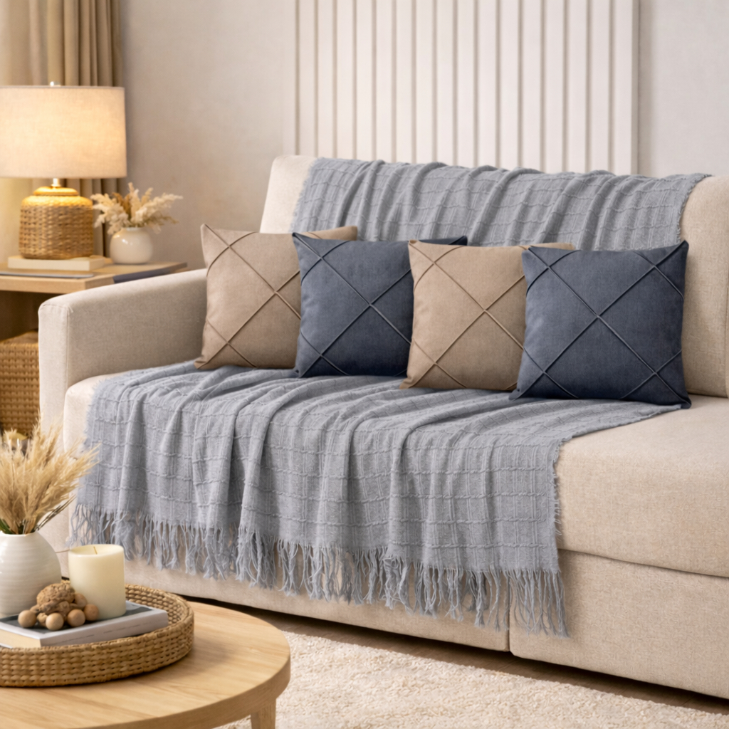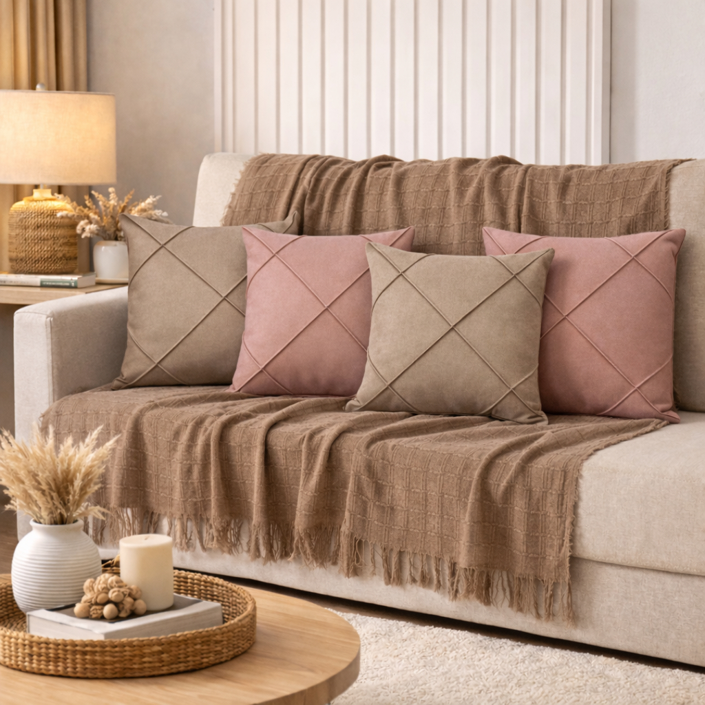 Kit Manta + Capas de Almofada Sued Drapeada Decoração Sala Sofá Manta P 1,40 x 1,70m
