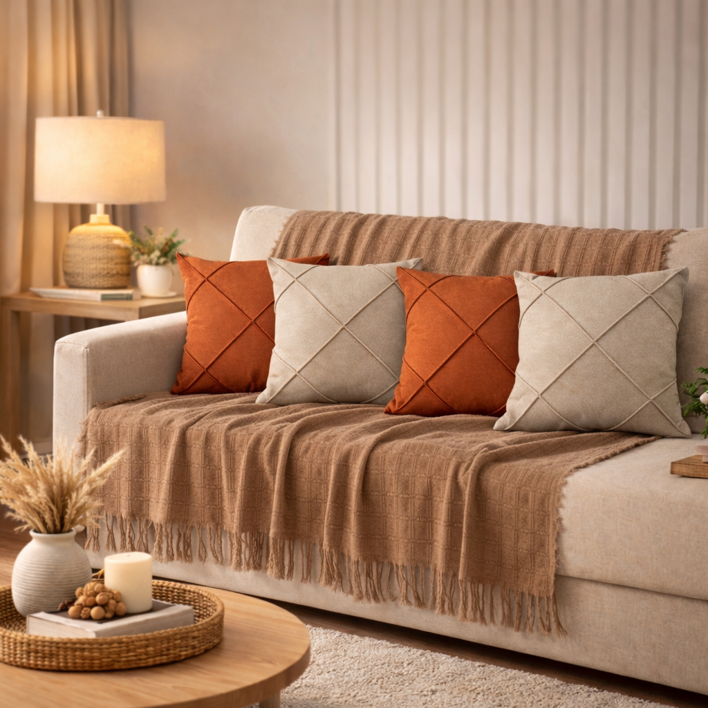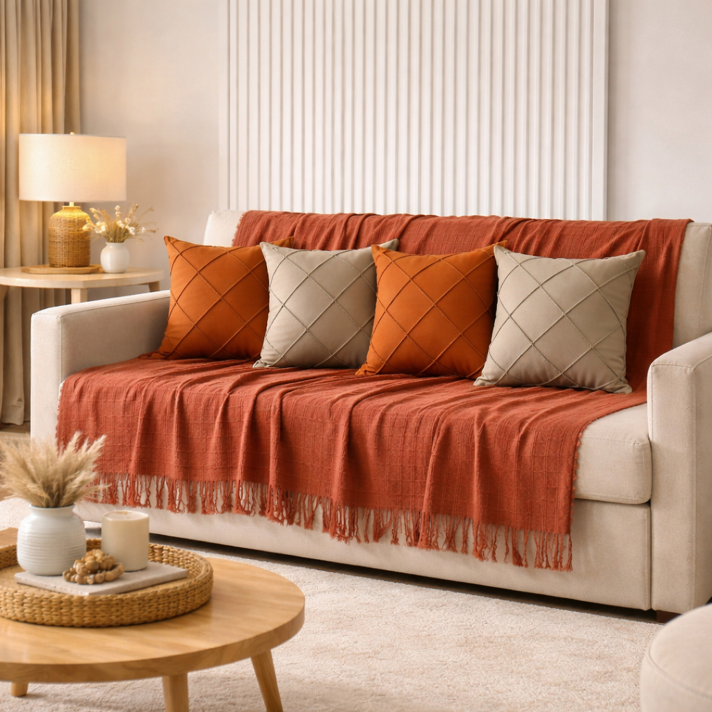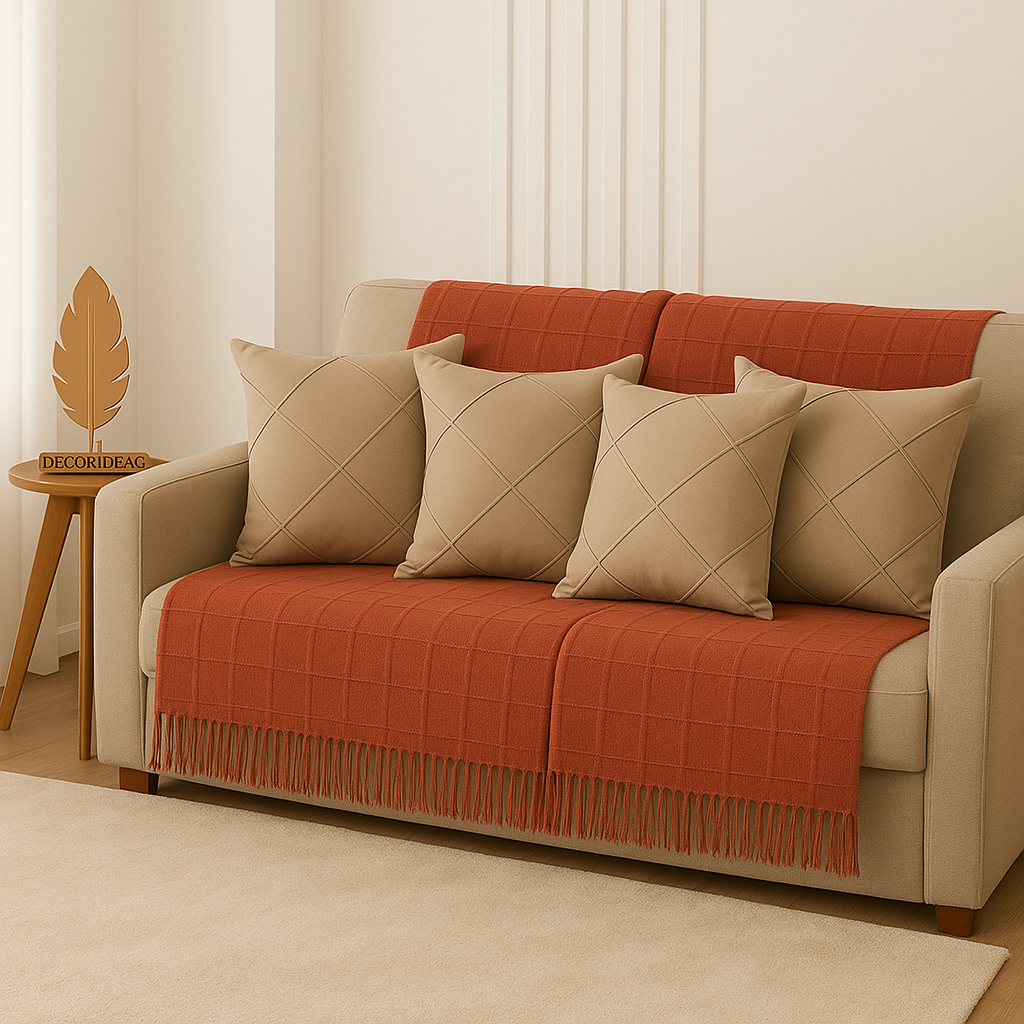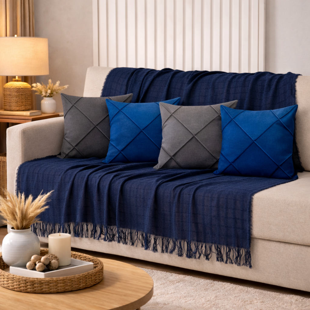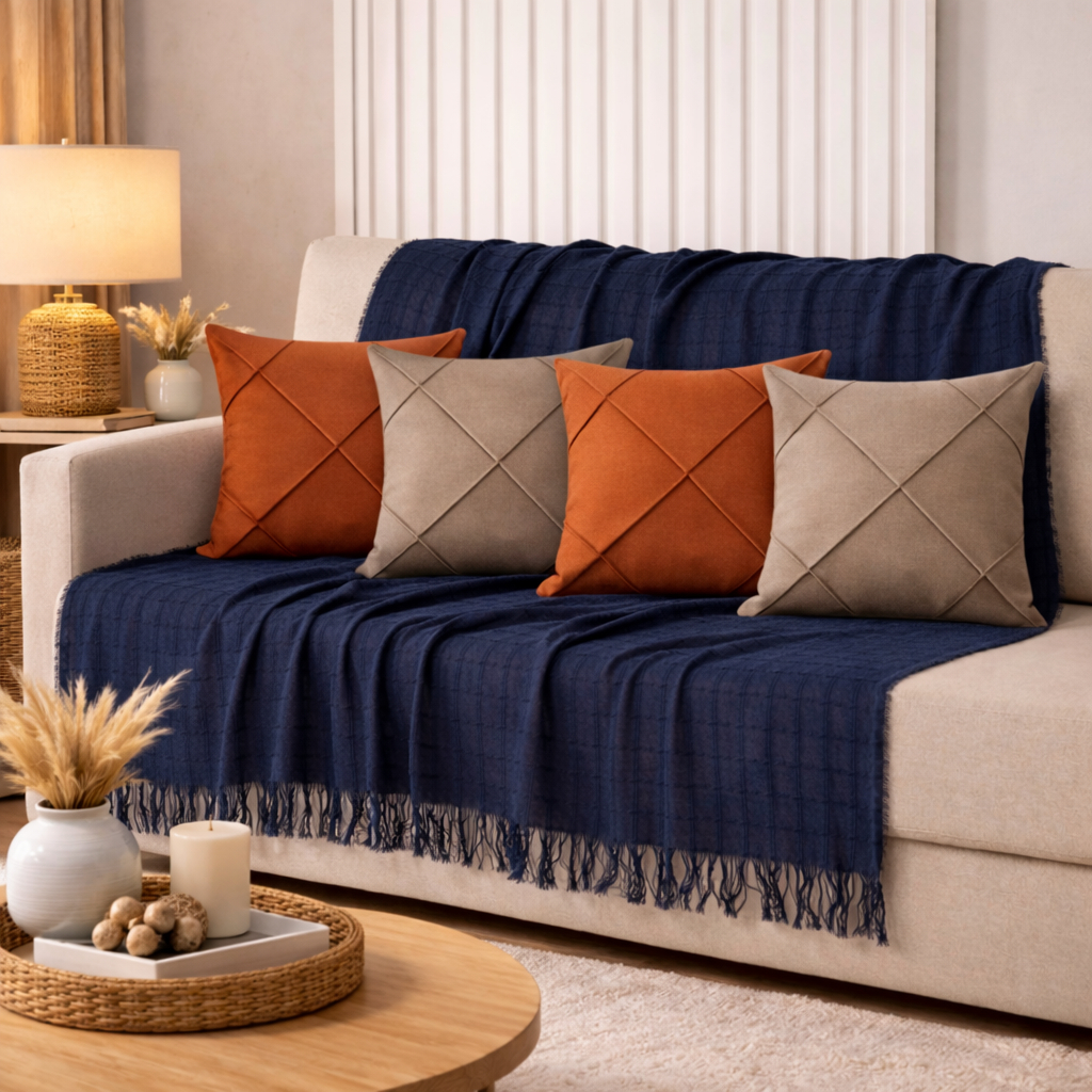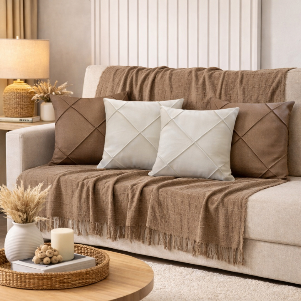 Kit Manta + Capas de Almofada Sued Drapeada Decoração Sala Sofá Manta P 1,40 x 1,70m