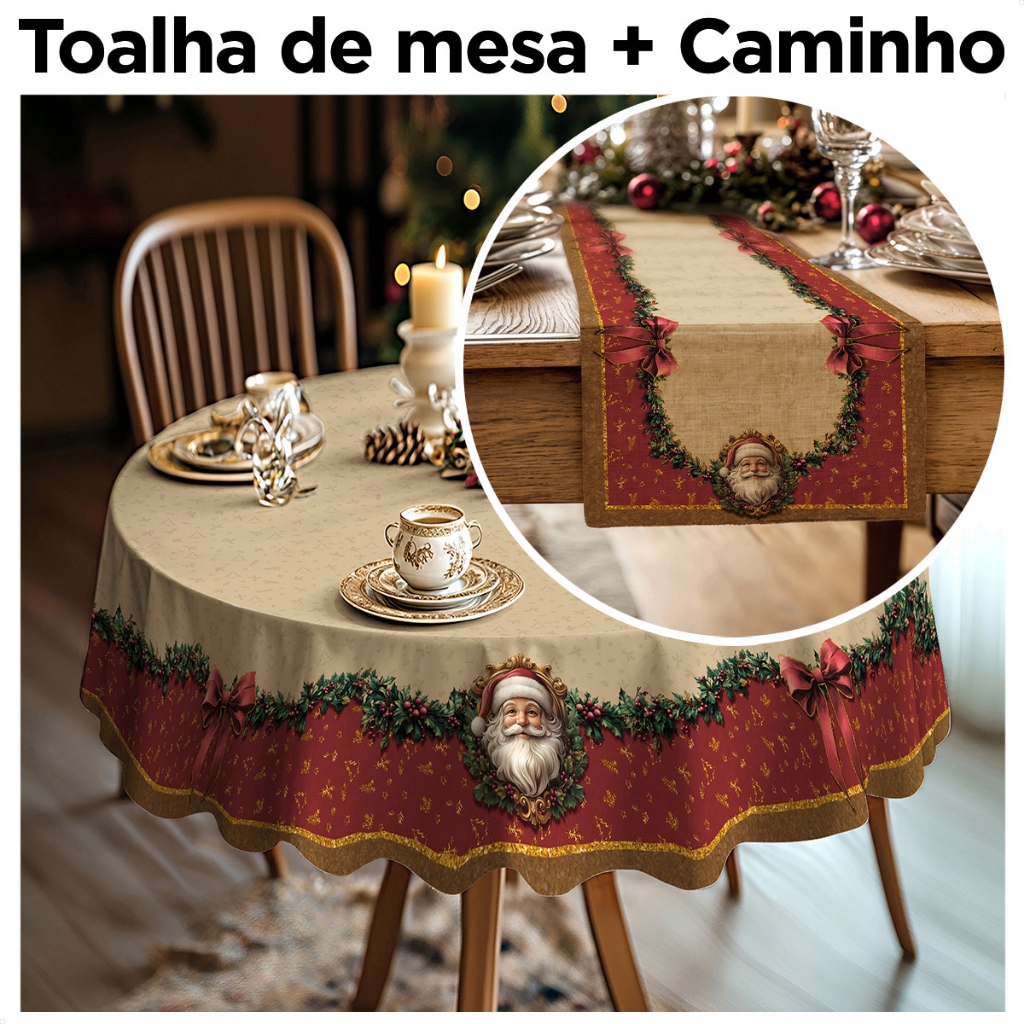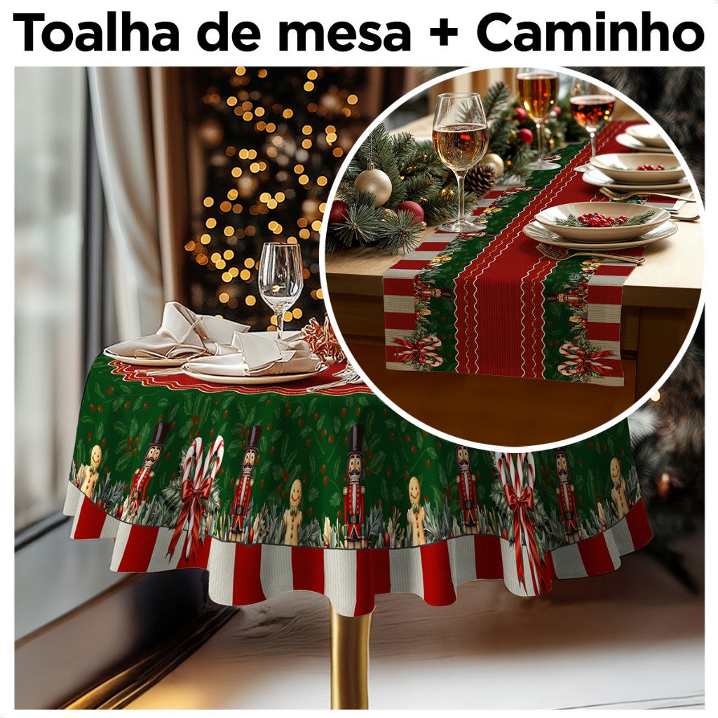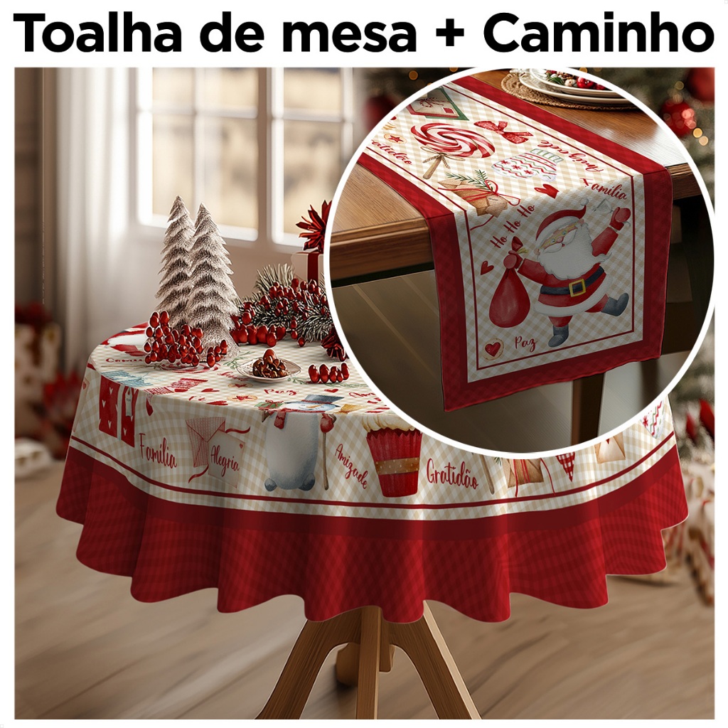 Kit Toalha de Mesa 4 Lugares Redonda Natal 1,40m + Caminho de Mesa 1,40x0,40m - Mesa Posta Natalina