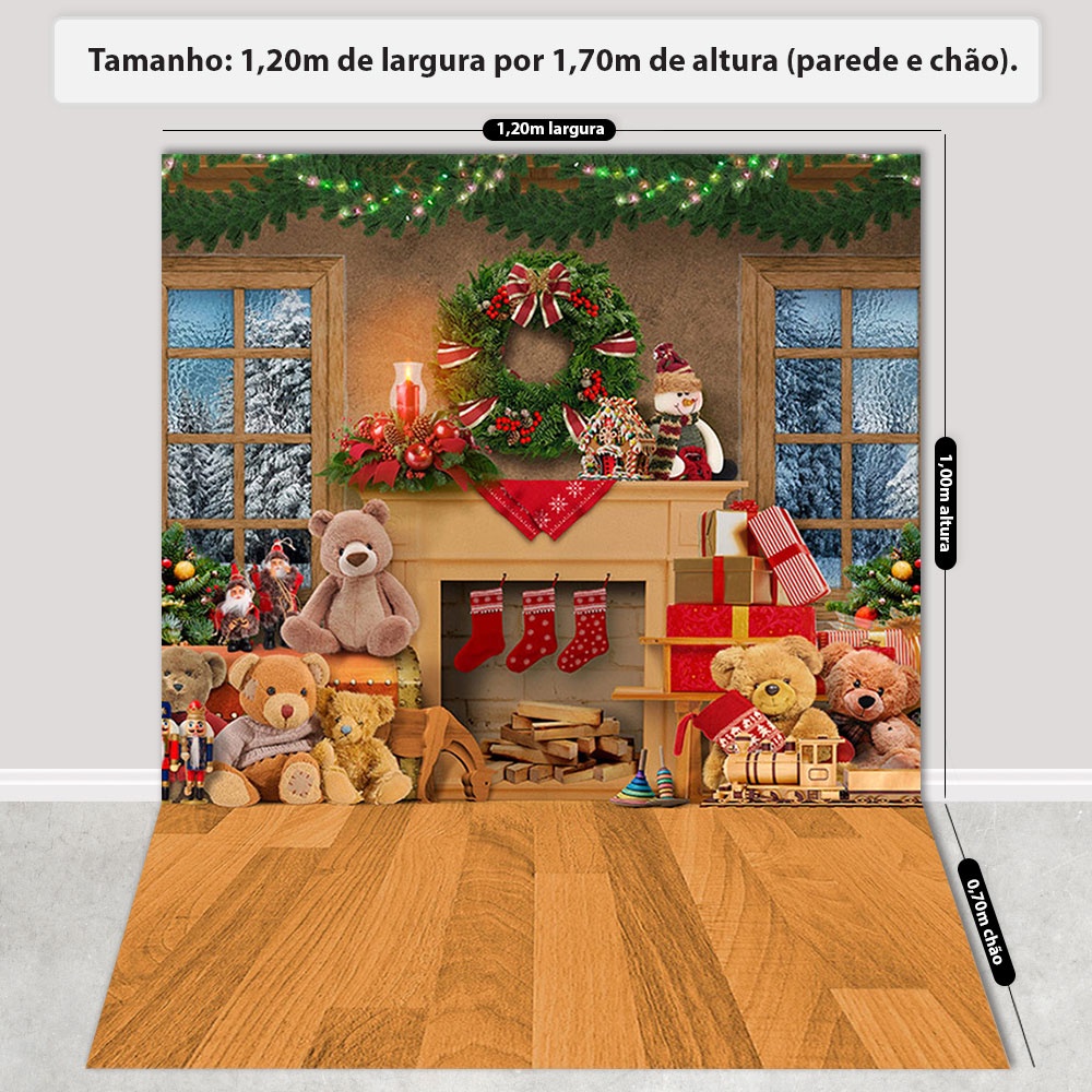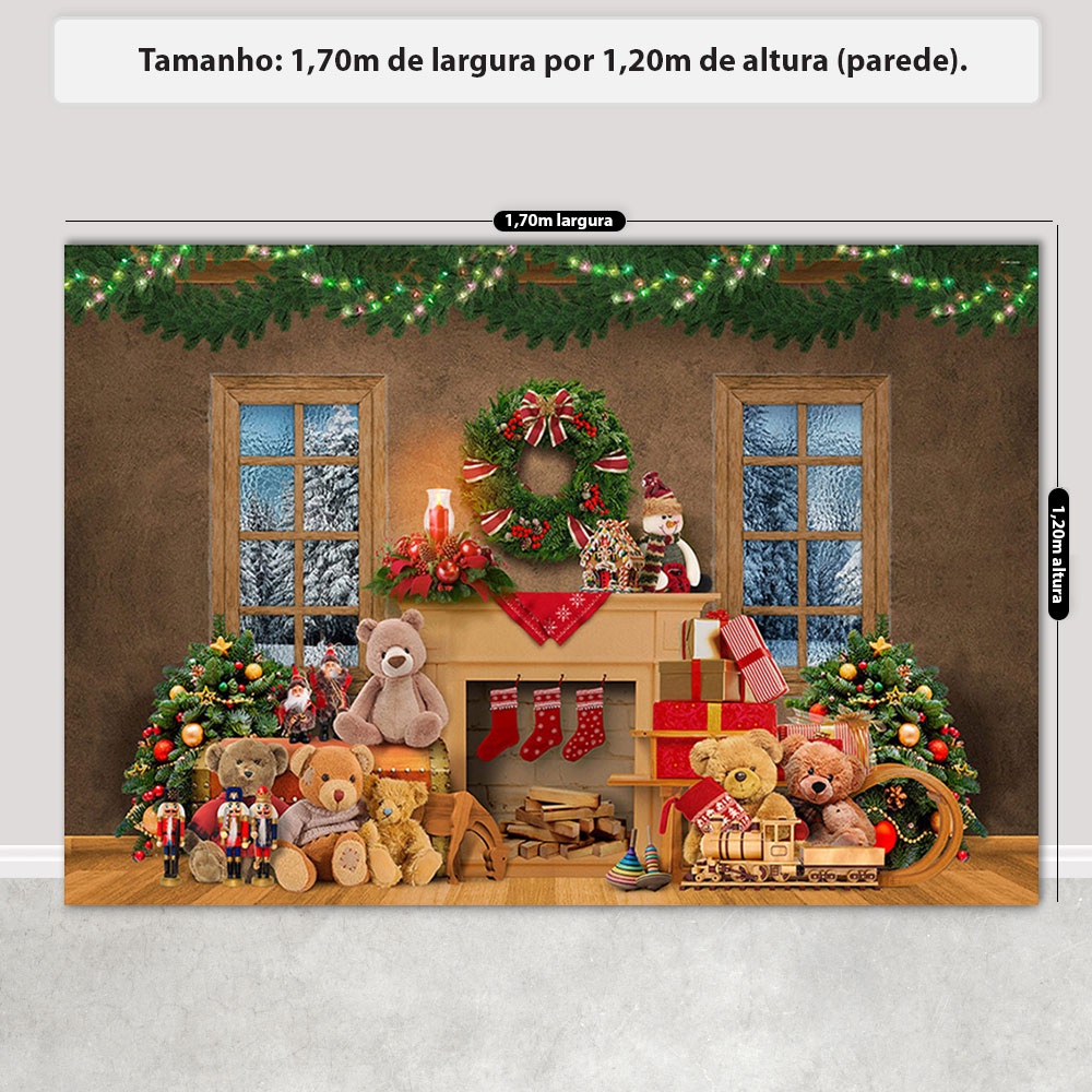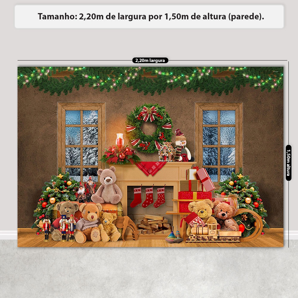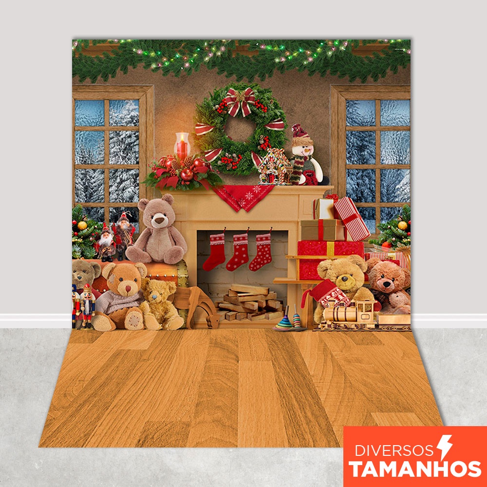 Painel Fundo de Natal Decoração Cenário Natalino Lareira Ursos de Pelúcia Em Tecido Sublimado