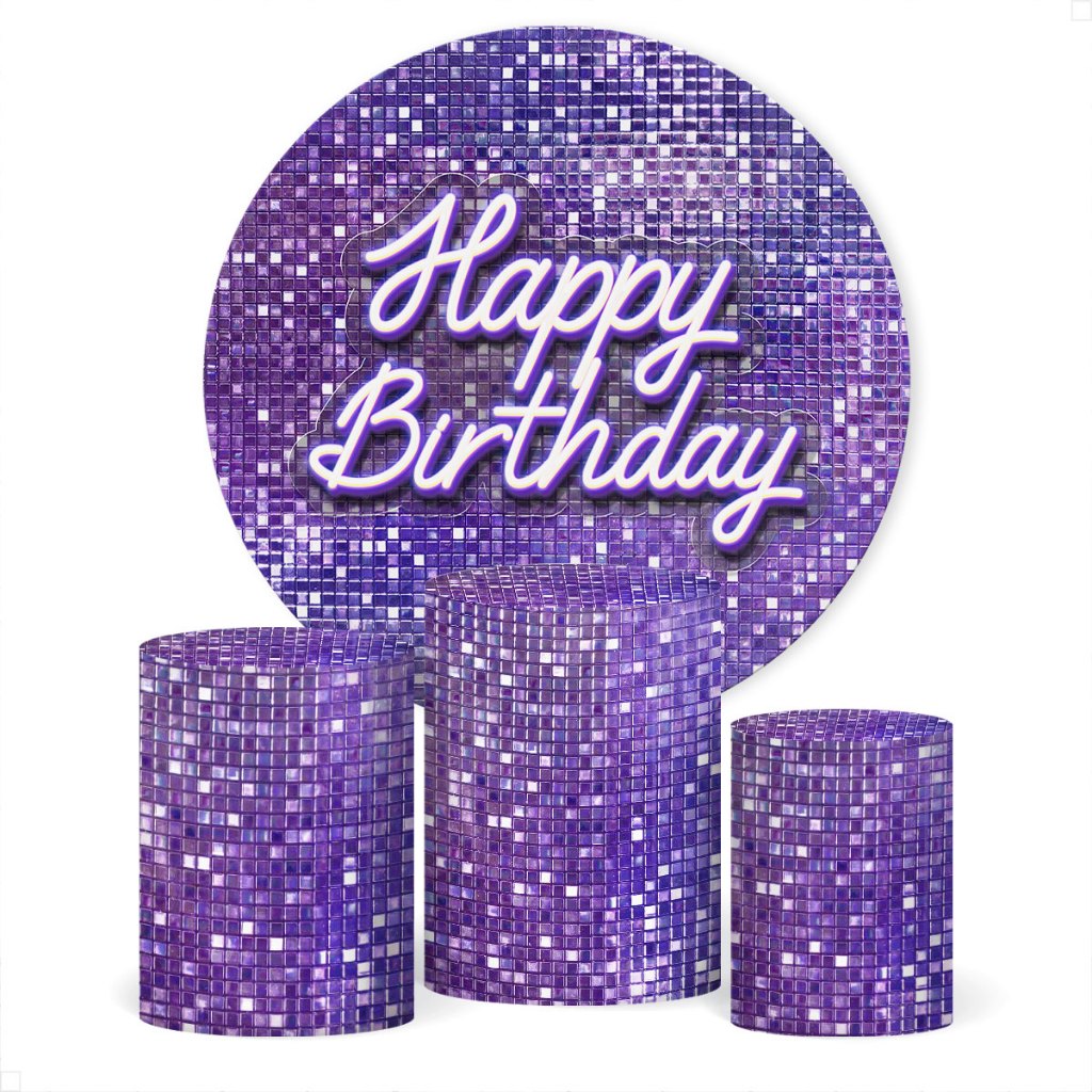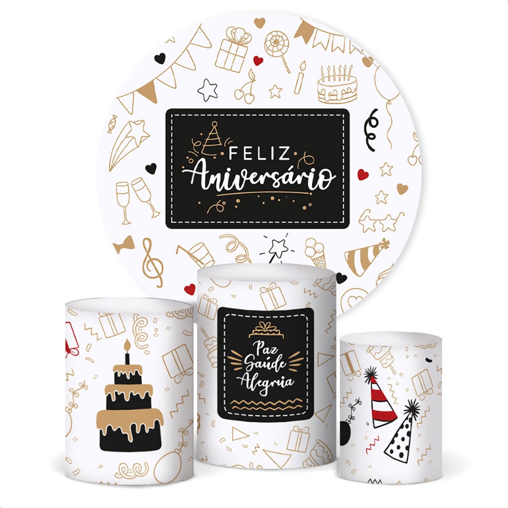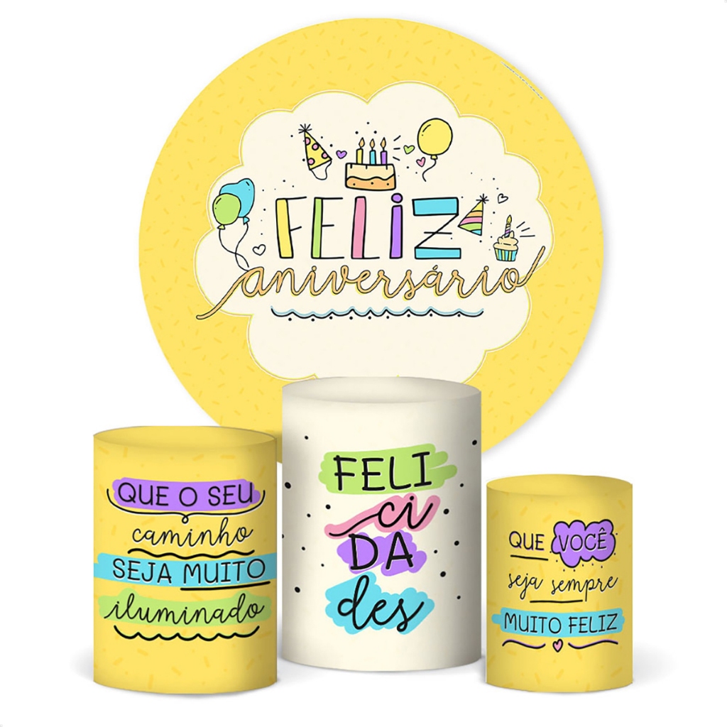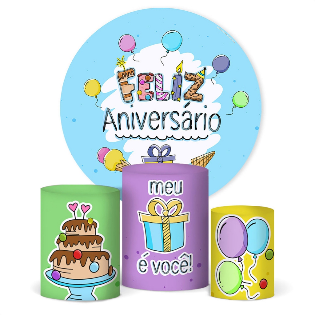 Trio Capa De Cilindro E Painel Redondo Festa Feliz Aniversário Decoração Em Tecido Veste Fácil
