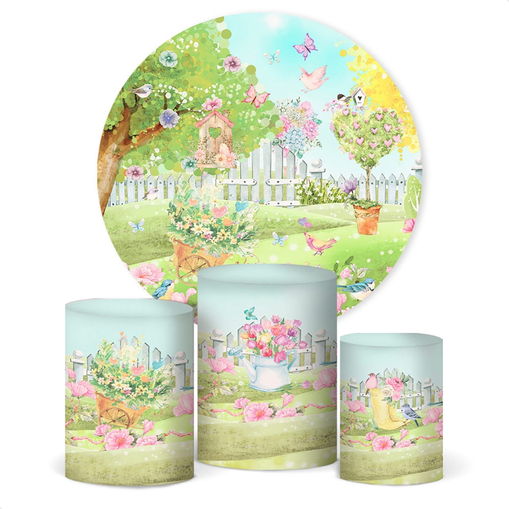 Painel de Festa Jardim Redondo e Capa de Cilindro Decoração Jardim Em Tecido Veste Fácil