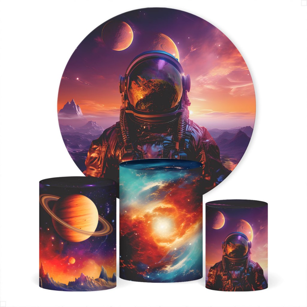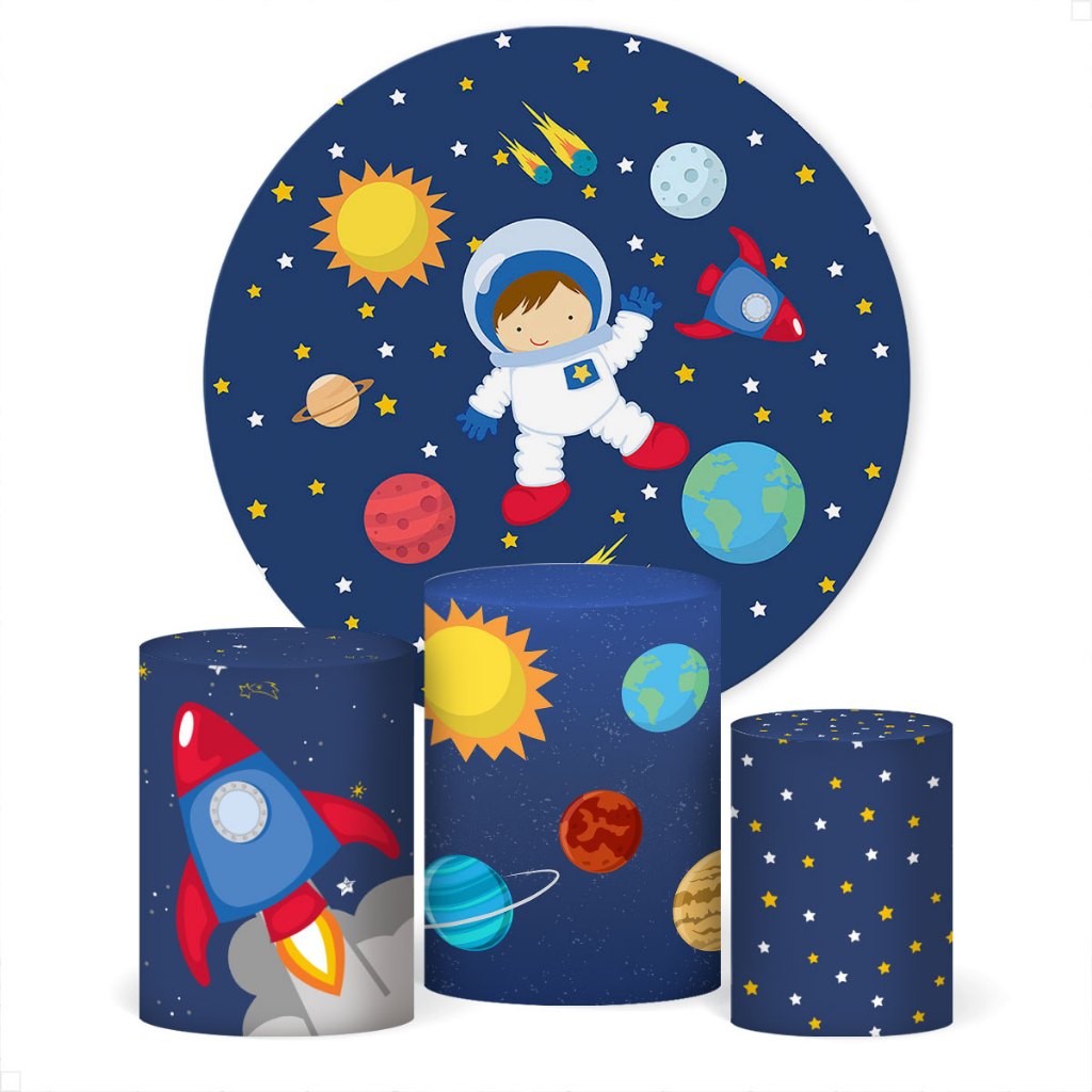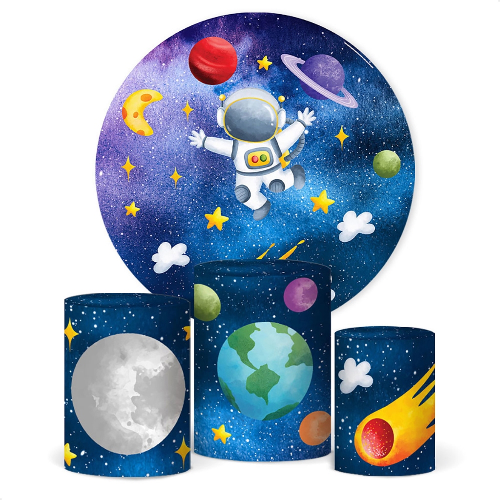 Kit Painel Redondo Astronauta + Trio Capas Cilindro Em Tecido C/Elástico