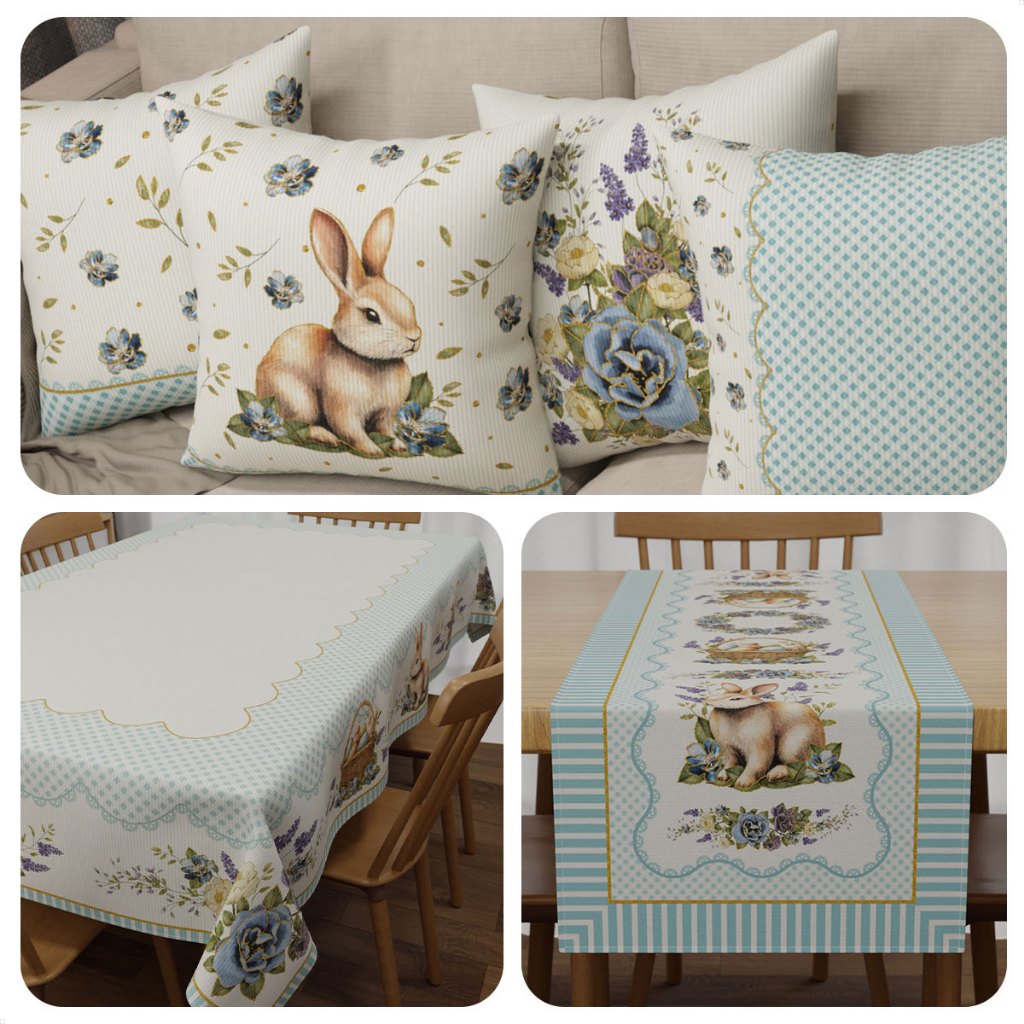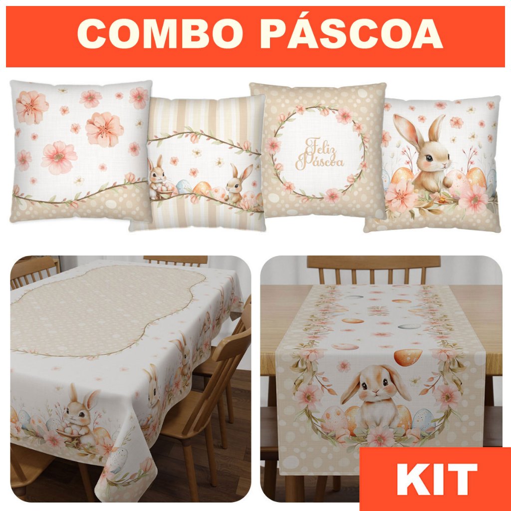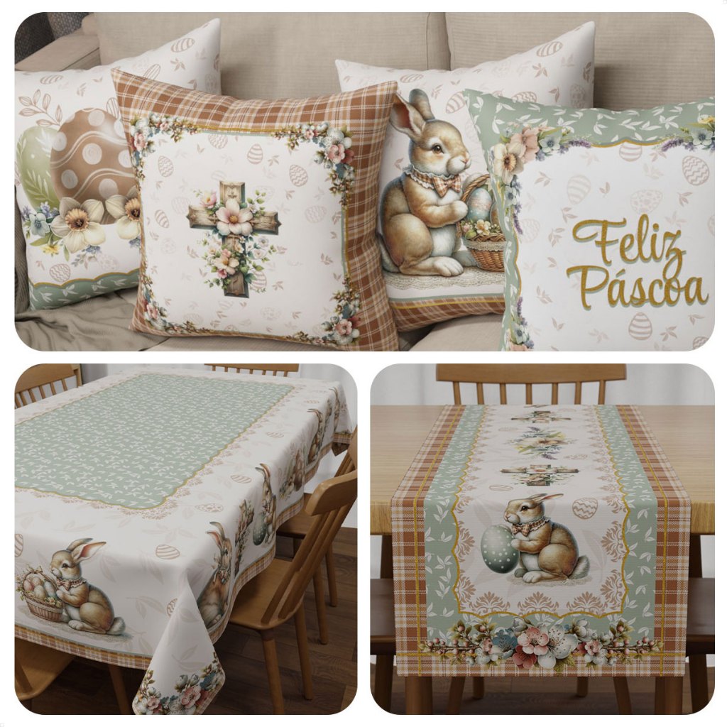 Kit Decoração de Páscoa: 04 Capas de Almofadas + Toalha de Mesa Retangular + Trilho Caminho Mesa