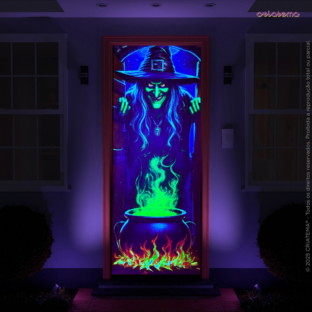 Capa de Porta Decoração Halloween Bruxa Tecido Sublimado Neon 0,85x2,10m C/Elástico- Brilha C/ Luz Negra