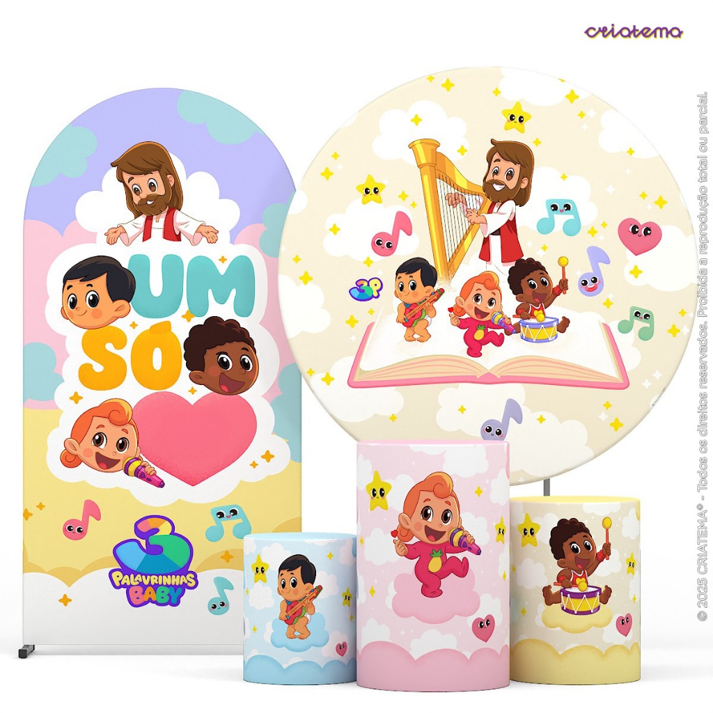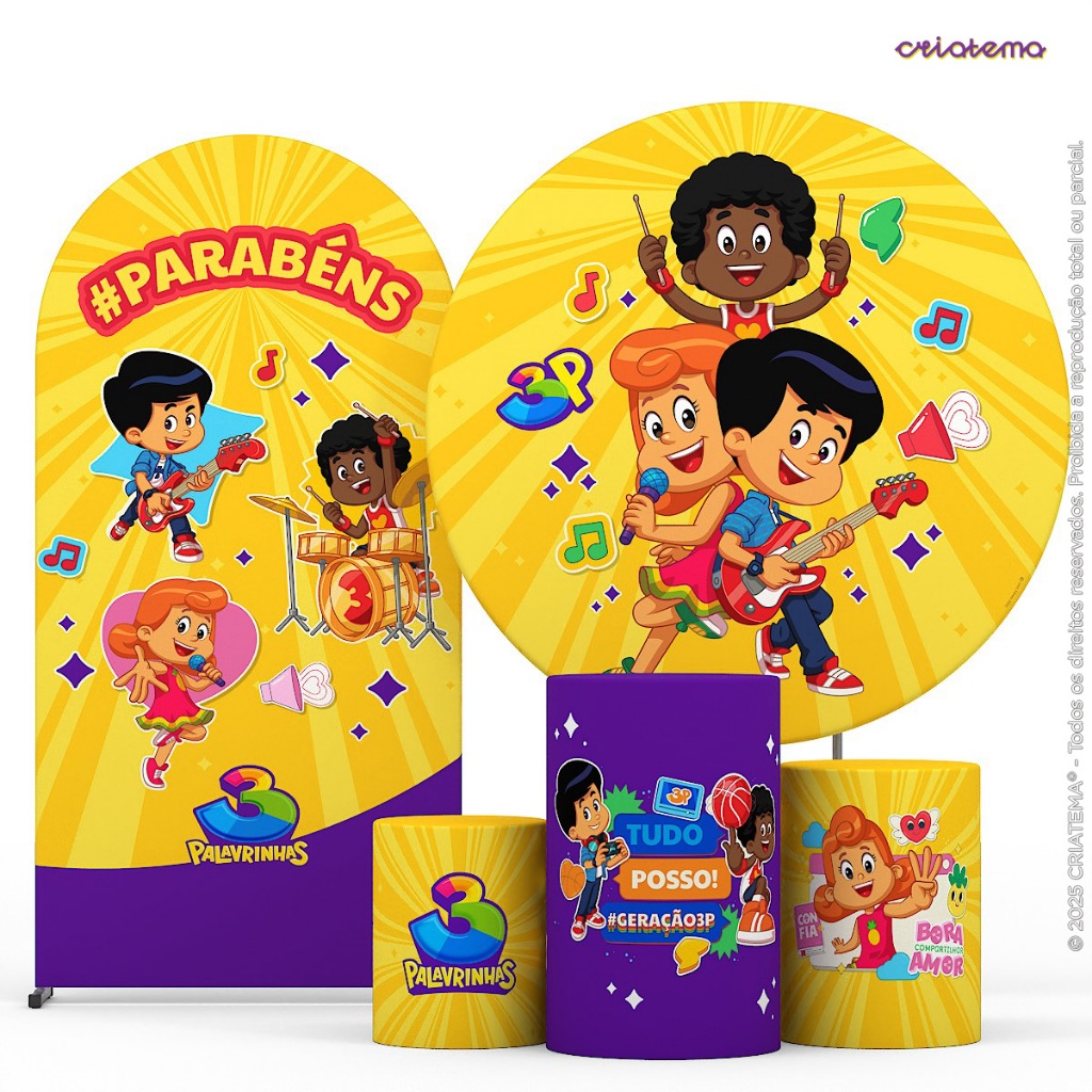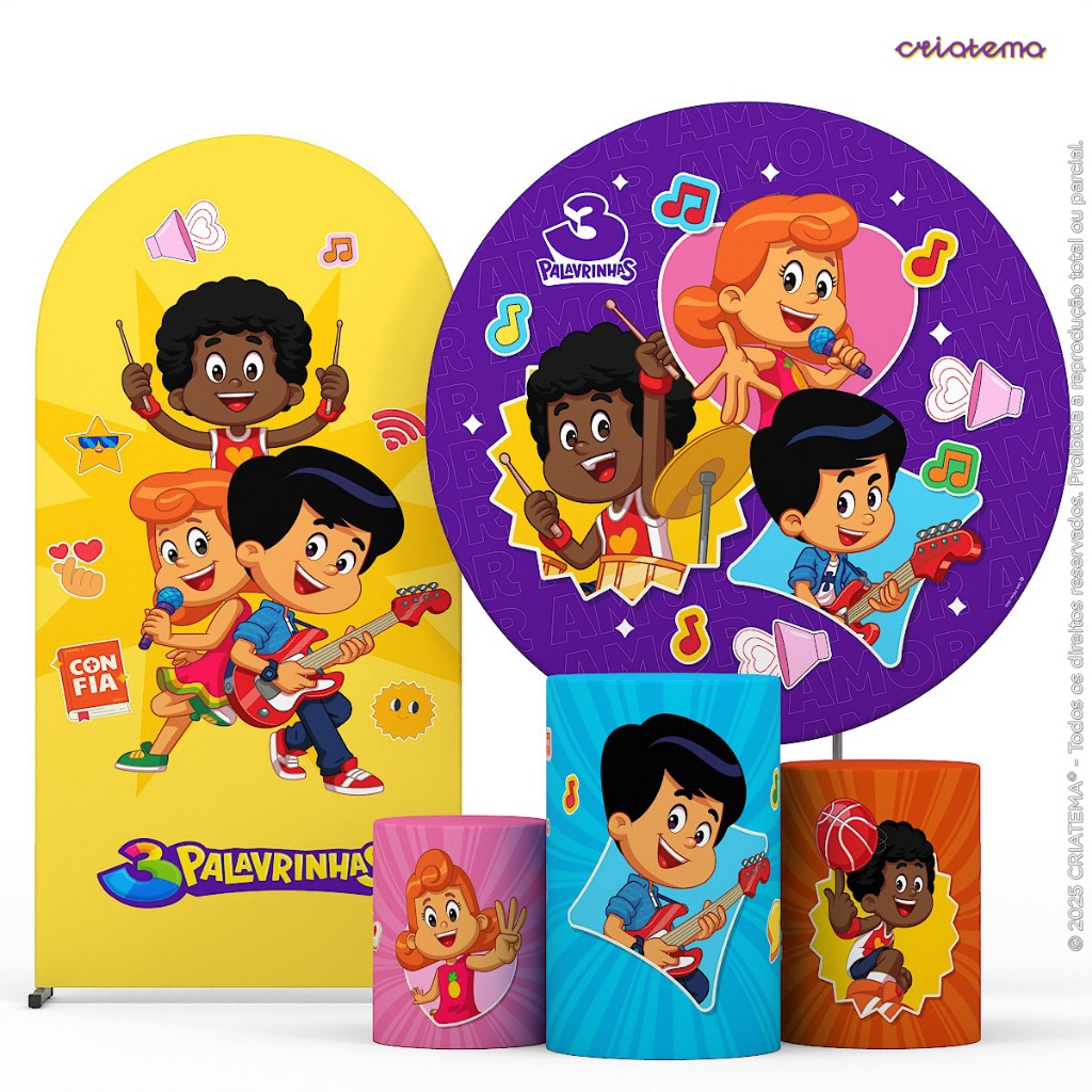 Kit Painel de Festa e Cilindro Decoração 3 Palavrinhas Aniversário Infantil Tecido Veste Fácil - Licenciado