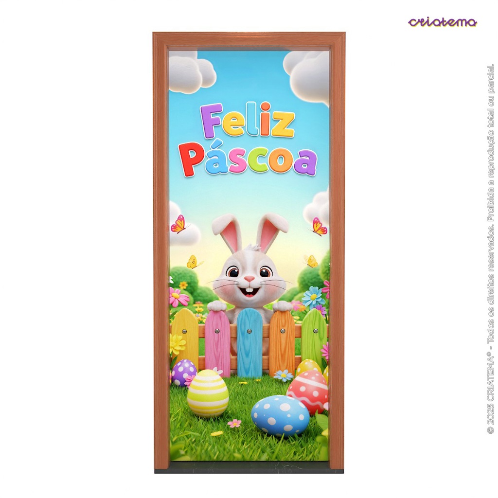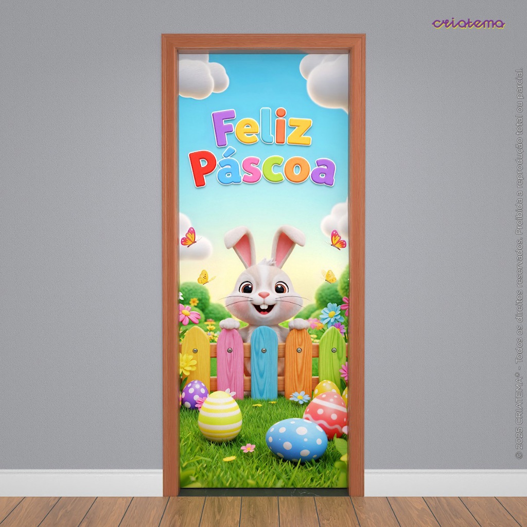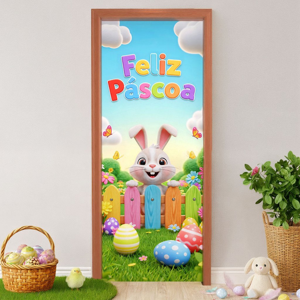 Capa para Porta Páscoa Infantil Coelhinho Decoração Em Tecido Sublimado 0,80x2,10m Veste Fácil