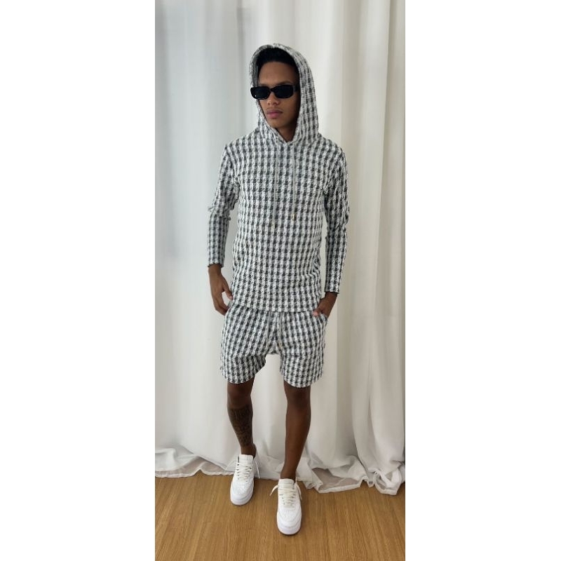 Blusa Manga Longa Sudadera + Short Malha Tweed Xadrez