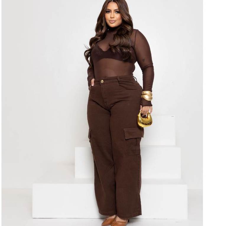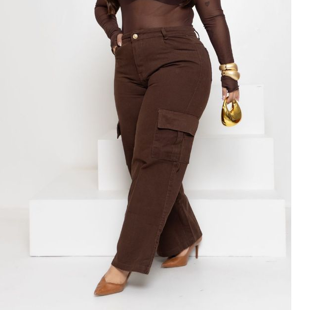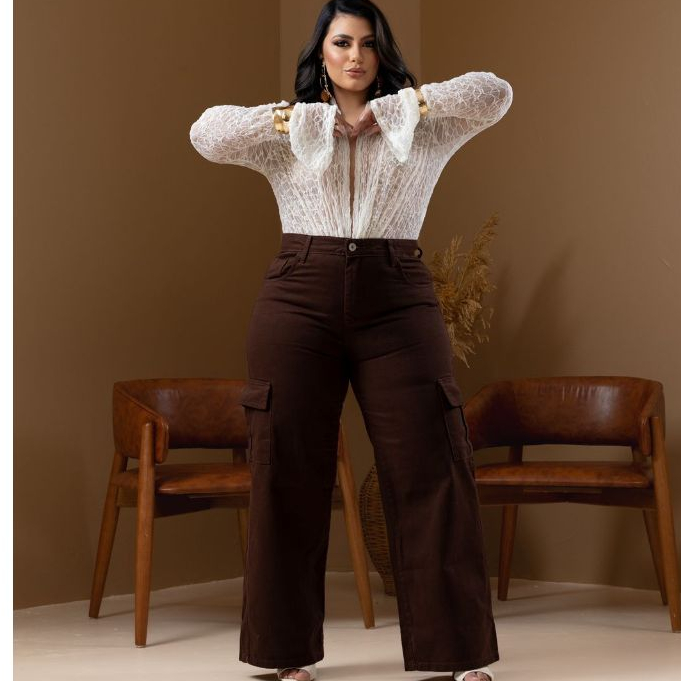 Calça Jeans Feminina Wide Leg Cargo Plus Size Marrom