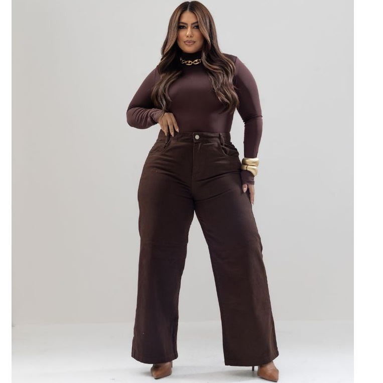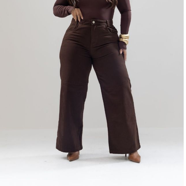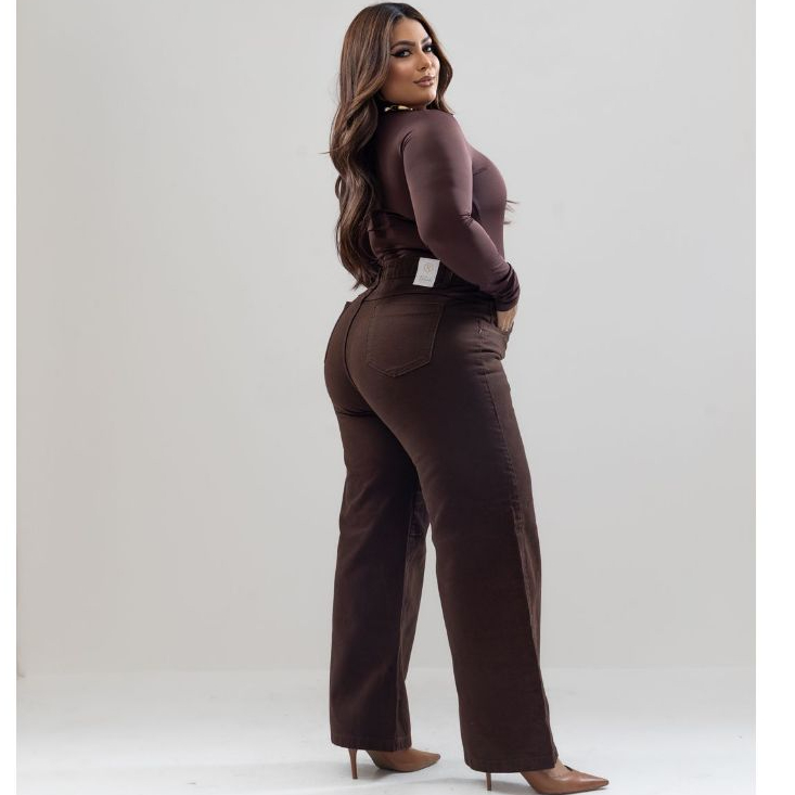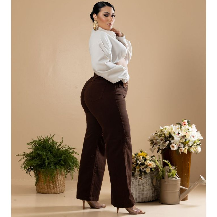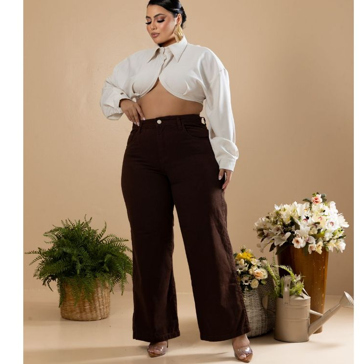 Calça jeans Feminina Wide leg Plus Size Marrom