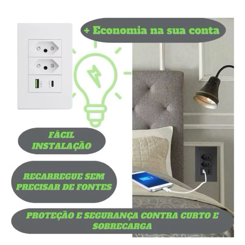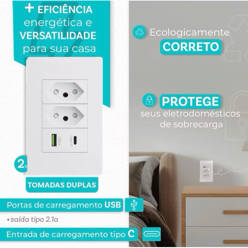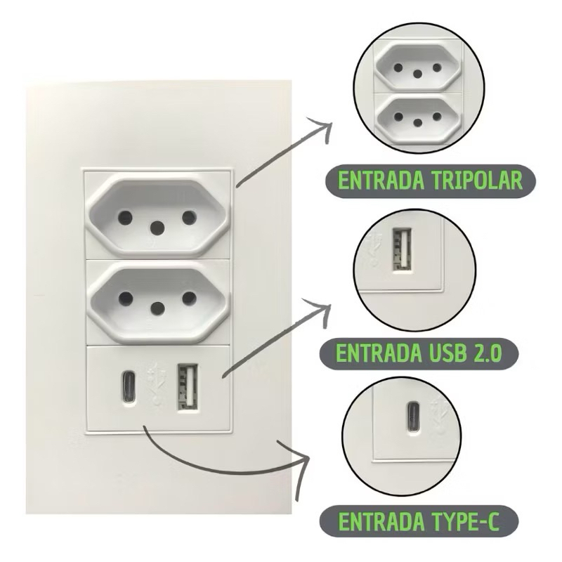 Tomada USB Duo 2 Tomada 1 Entradas USB+1 Type-C
