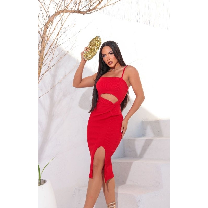 Vestido Midi Feminino Justo com Alça Fina, Recorte na Cintura e Fenda Elegante