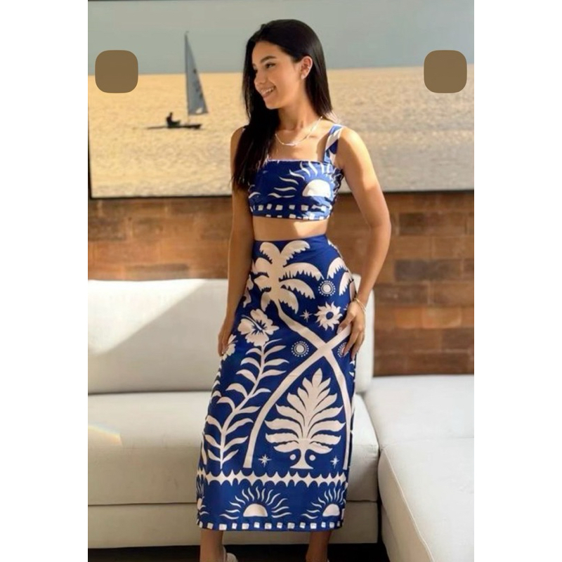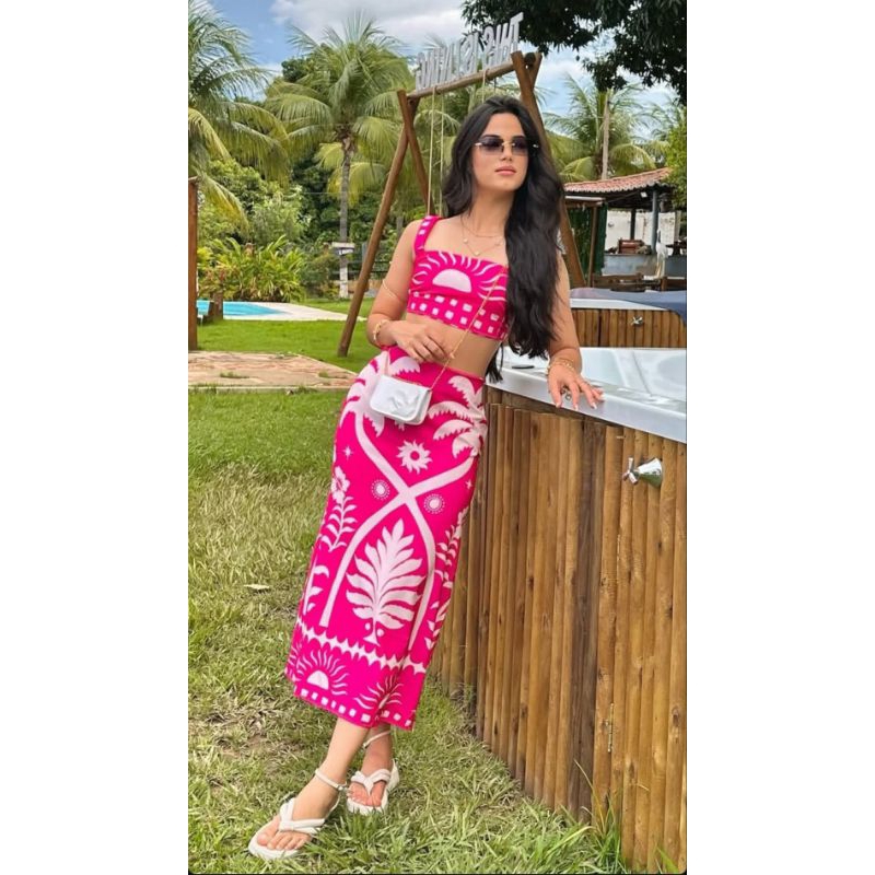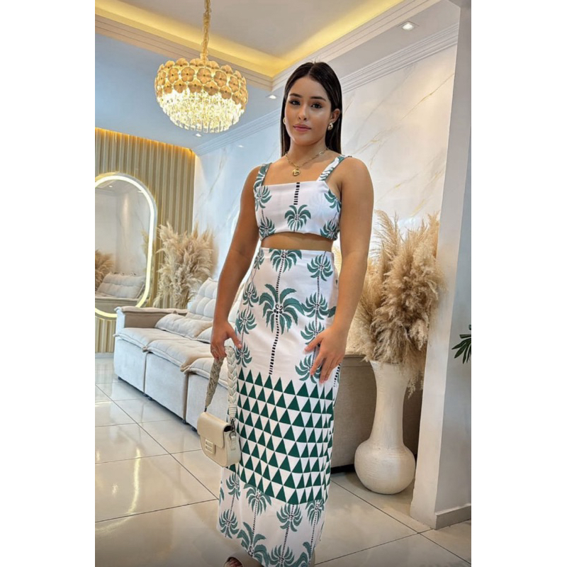 conjunto tendência, saia com cropped, look verão estampa exclusiva, saia longa,