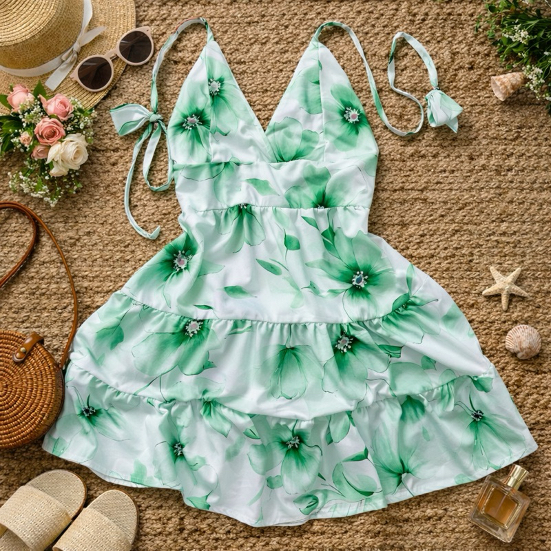vestido feminino três Marias, vestido rodadinho estampa exclusiva, com decote, amarração ajustável, godê ,curtinho.