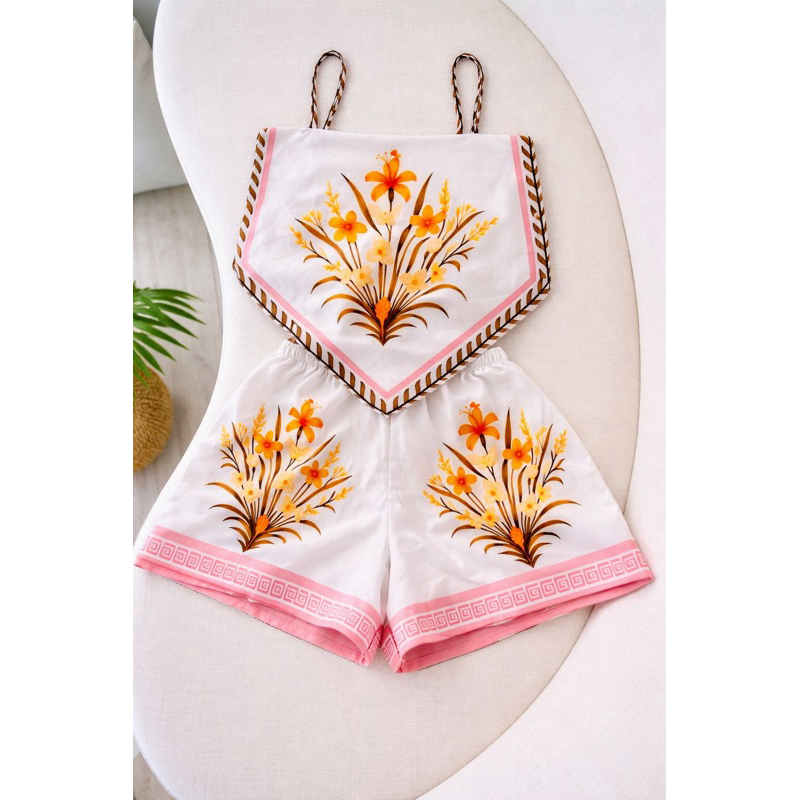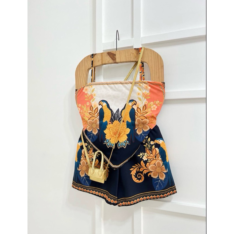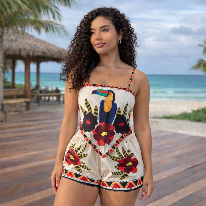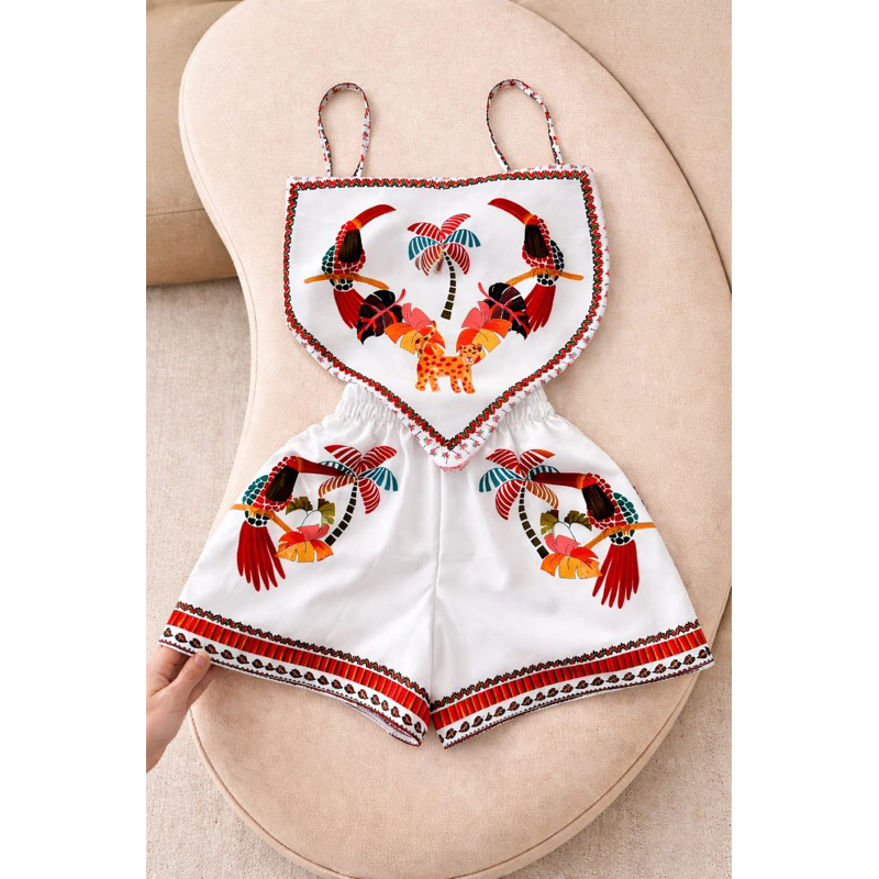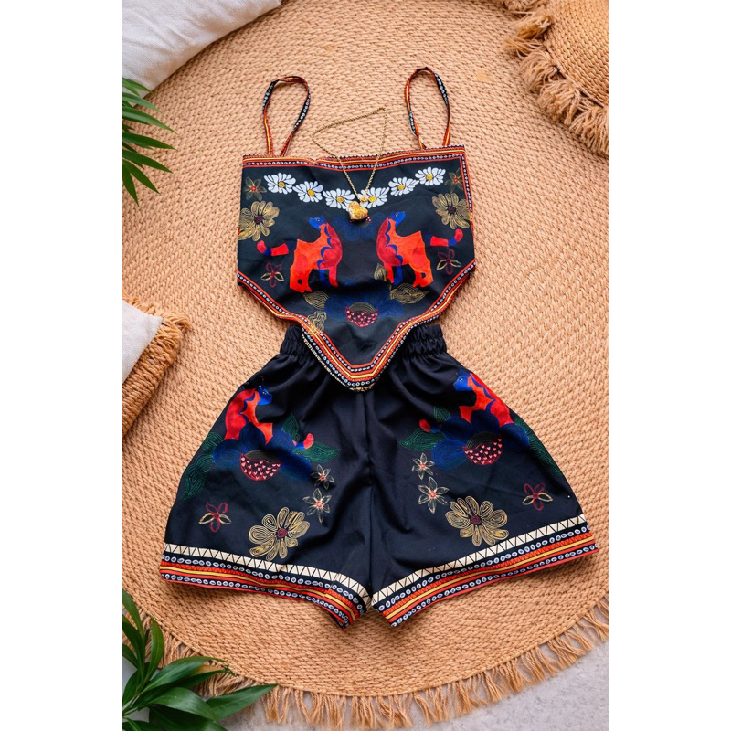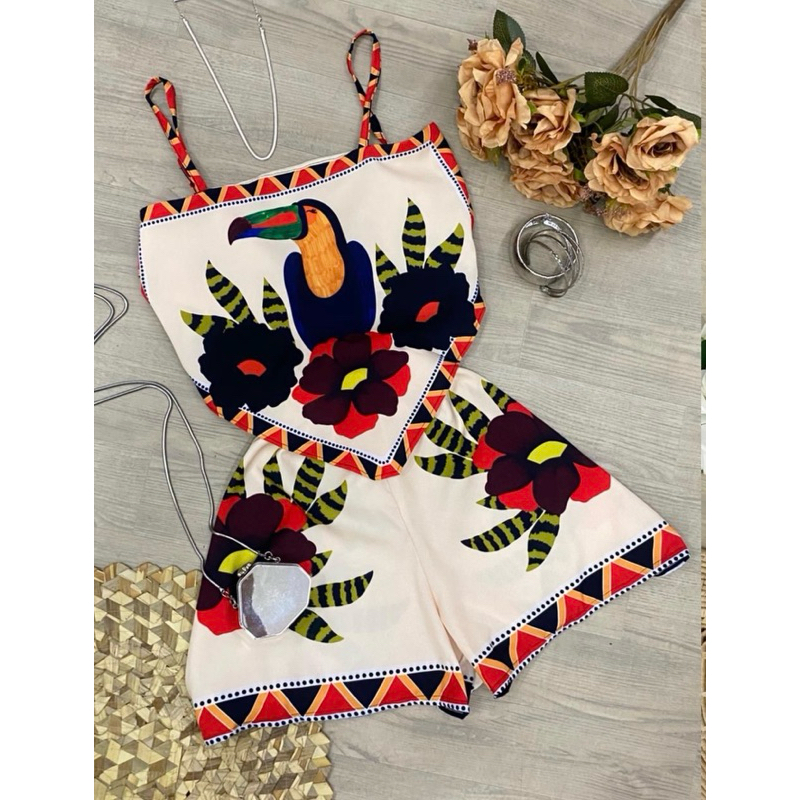 conjunto tendência estampas localizadas short cintura alta com Cropped lenço ajustável, estampas tropical, look carnaval