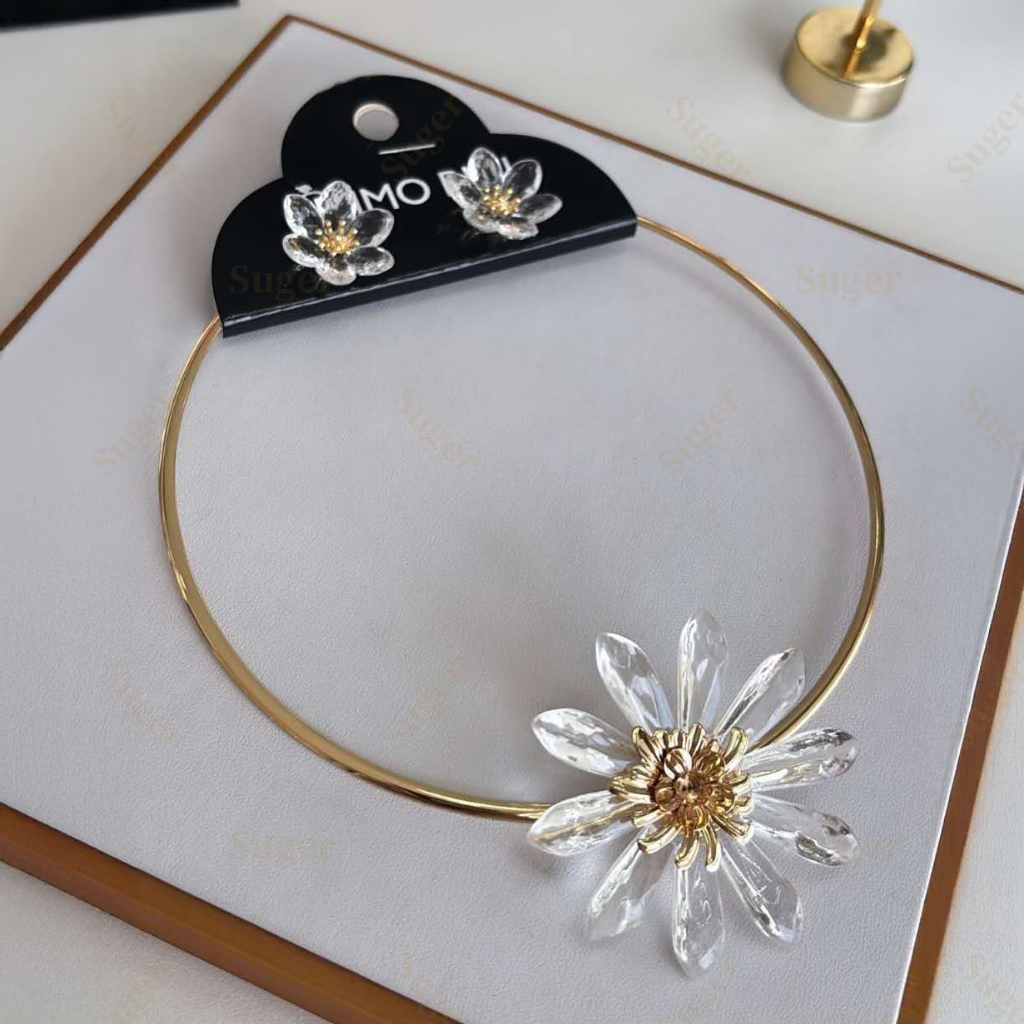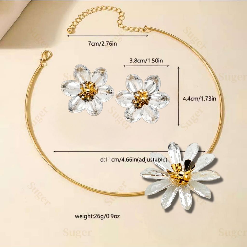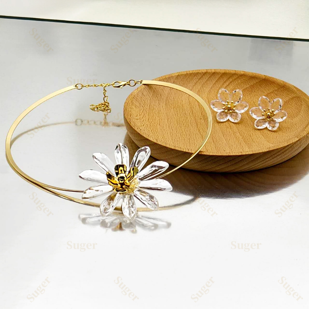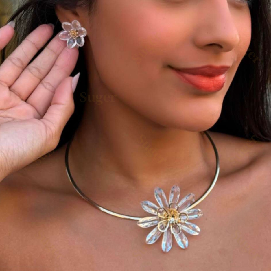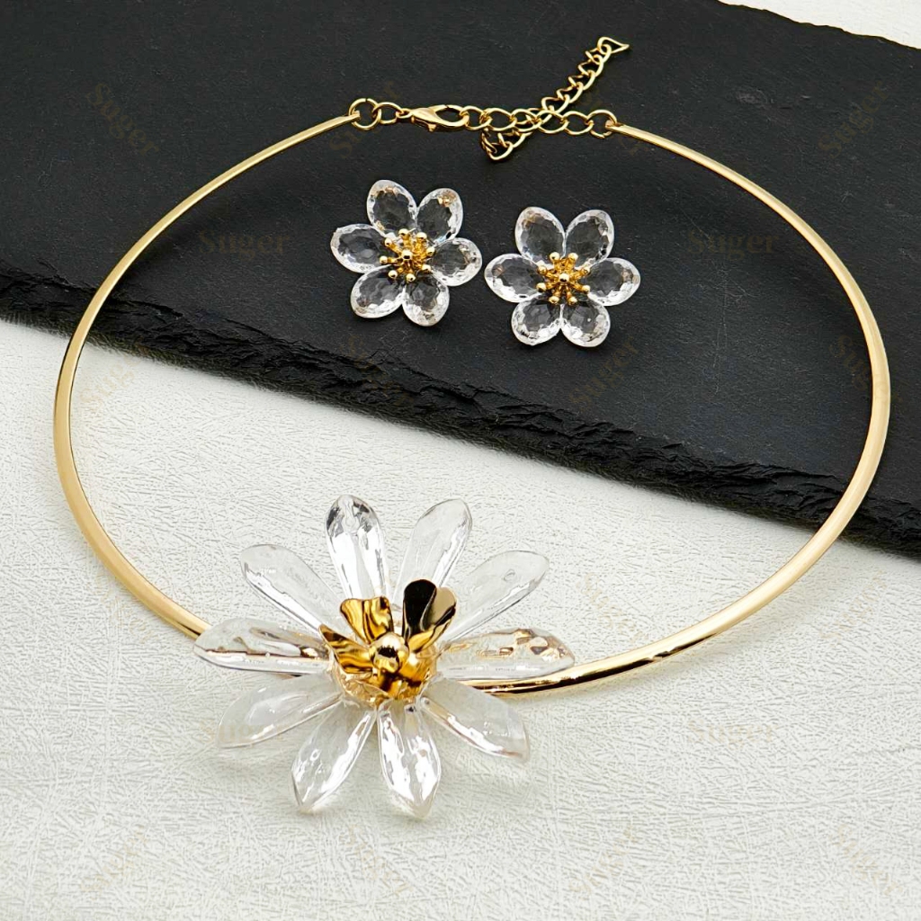 Colar & Brincos Conjunto Feminino Pingente Brilhe Florais Translúcidos Ouro & Prata Ajustável