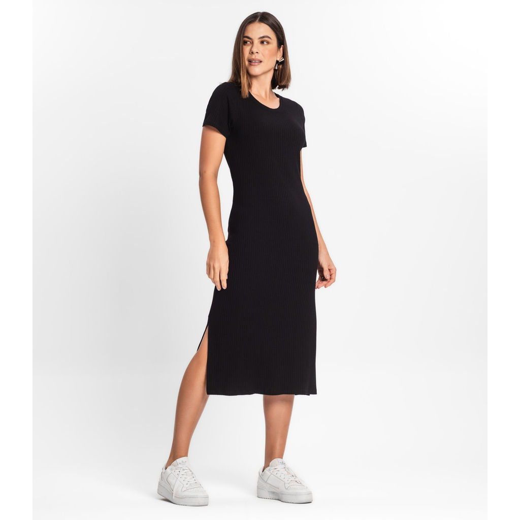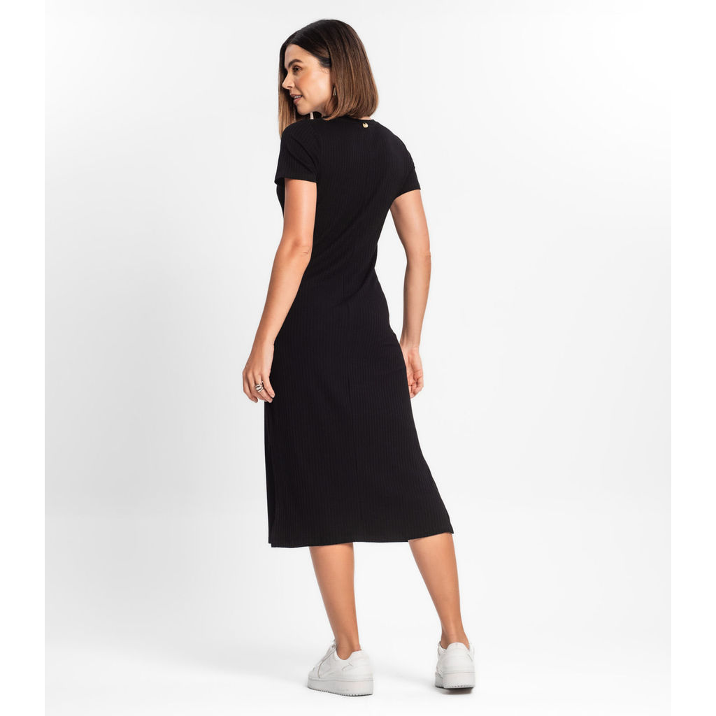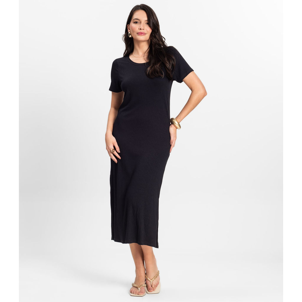 Vestido Midi Ribana Canelada Básico Rovitex Preto
