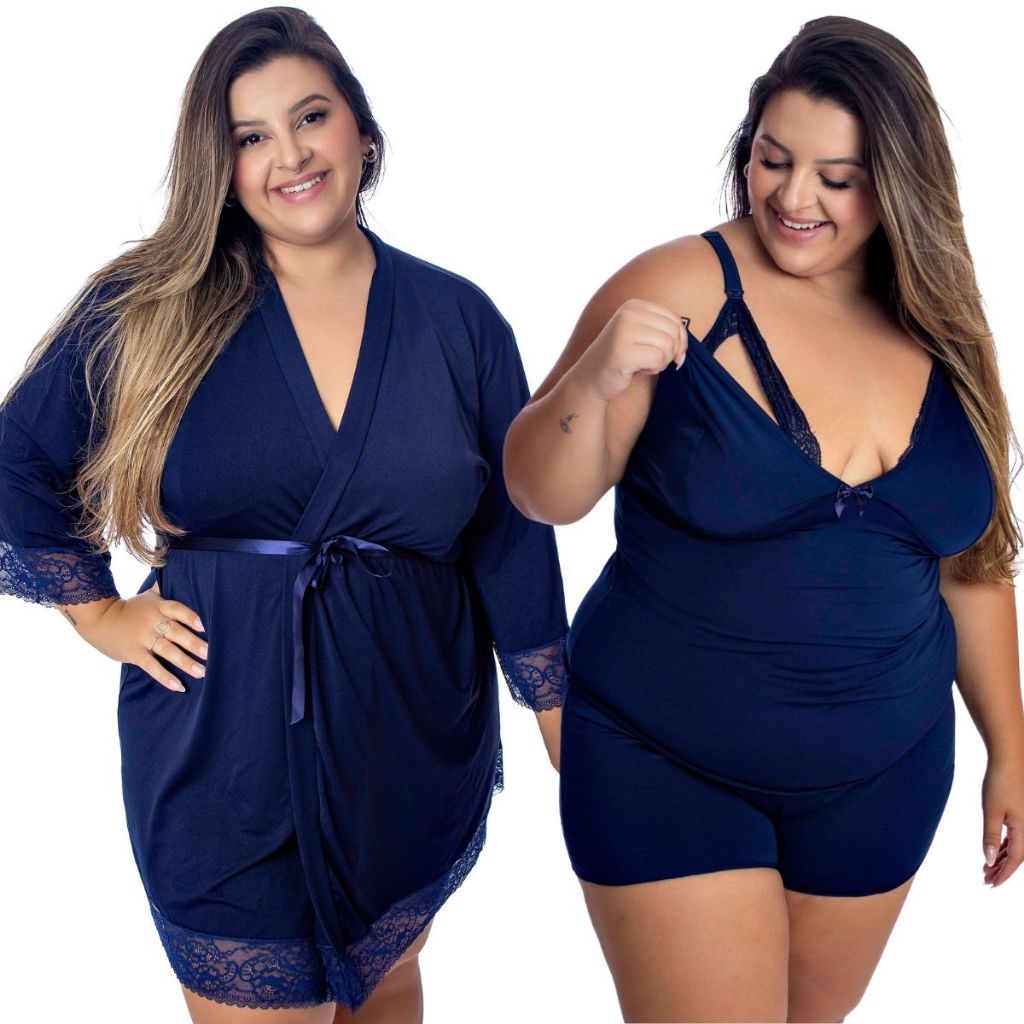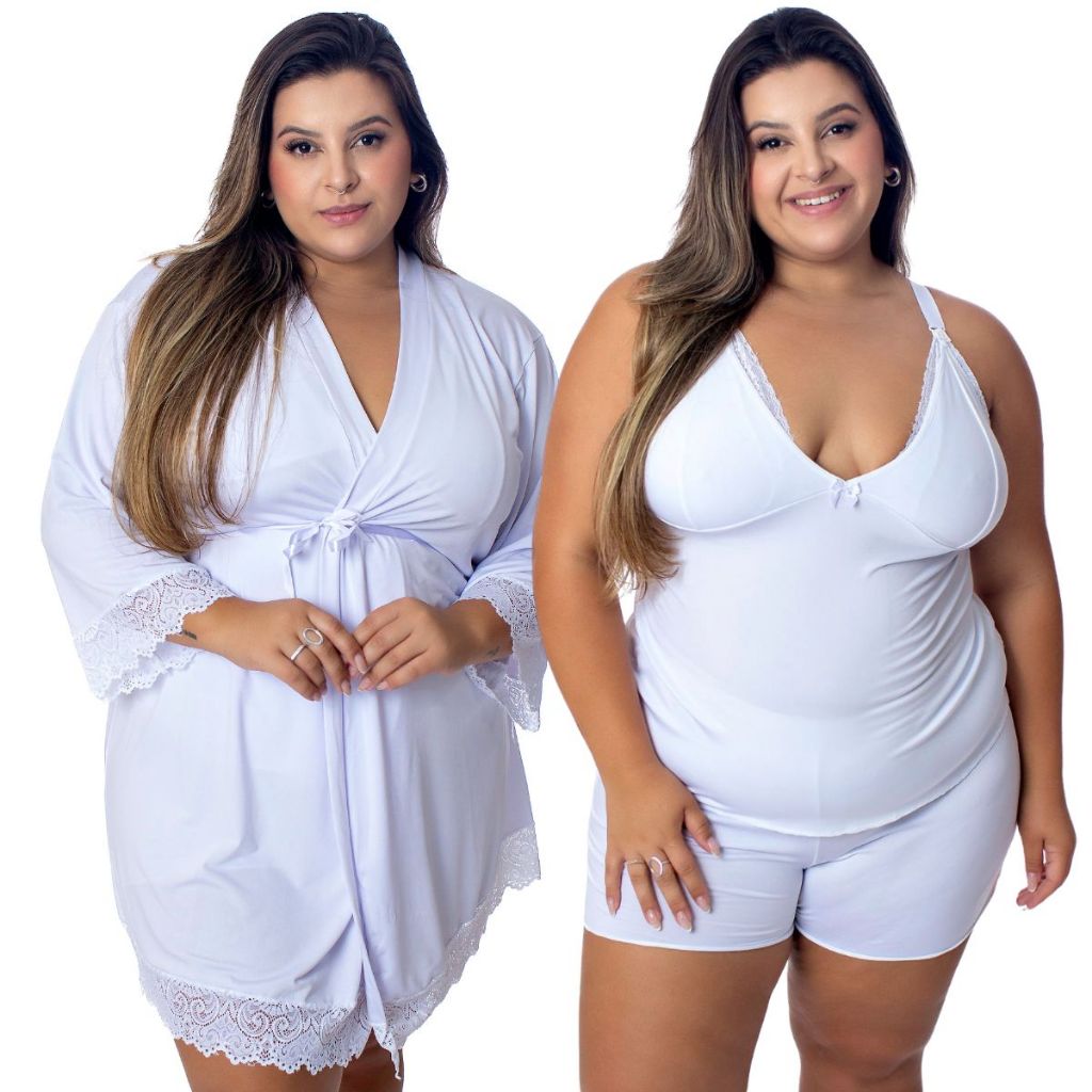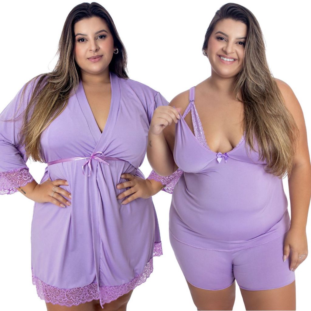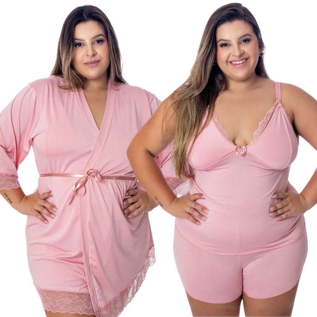 Baby Doll Amamentação Com Robe de Romantic e Renda Plus-Size