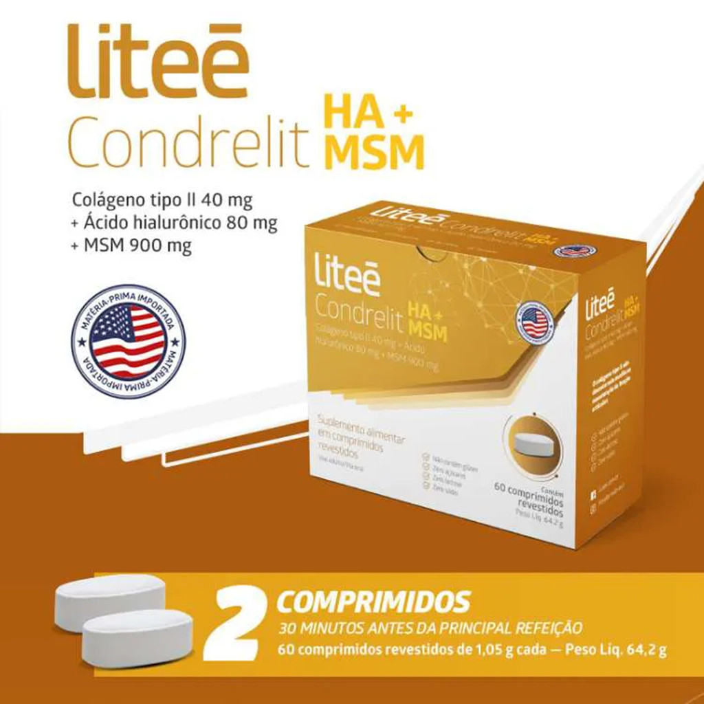 Condrelit 40MG Colágeno Tipo 2 + 80MG Ácido Hialurônico + 900MG MSM Com 60 Comp Revestidos - Liteé Farma